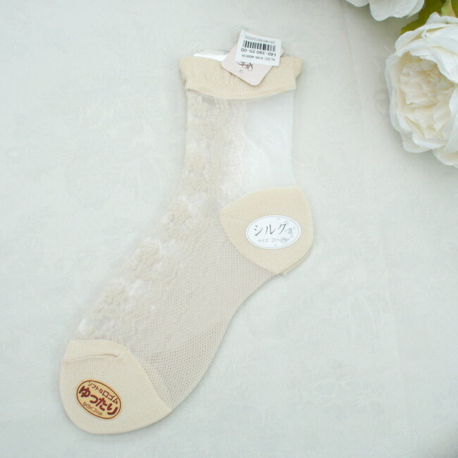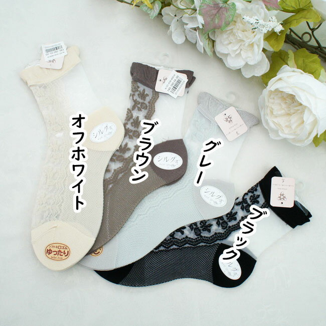 シースルーソックス シルク混 ローズレース柄 靴下 薔薇 クルーソックス レディース 日本製 ブラック オフホワイト グレー ブラウン ギフト ゆったり口ゴム