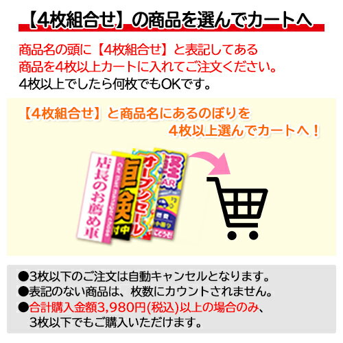 サイズ:2700mm×900mm 生地:テトロンポンジ ※デザインは予告なく変わることがございます。 ※ポールは付属しません。 ・特大のぼりは縦2,700×横900mmです。4mポールが必要です。 ・大のぼりは縦1,800×横700mmです。3mポールが必要です。 【メール便発送可】 配送方法「メール便」が可能です。メール便発送料は無料です。 ただし、メール便発送可能商品以外の商品と合わせてご注文の場合は通常の宅配便となりますのでご注意ください。 お得情報■※表示価格はセット価格ではなく【1枚当たり】の単価になります※■ ・商品名の頭に【4枚組合せ】と表記してある商品を4枚以上カートに入れてご注文ください。 4枚以上でしたら何枚でも問題ございません。 ・3枚以下のご注文は自動キャンセルとなりますので、予めご了承ください。 ・表記のない商品は、枚数にカウントされません。ご注意ください。 ≫【4枚組合せ】のぼり商品一覧はこちらお得情報