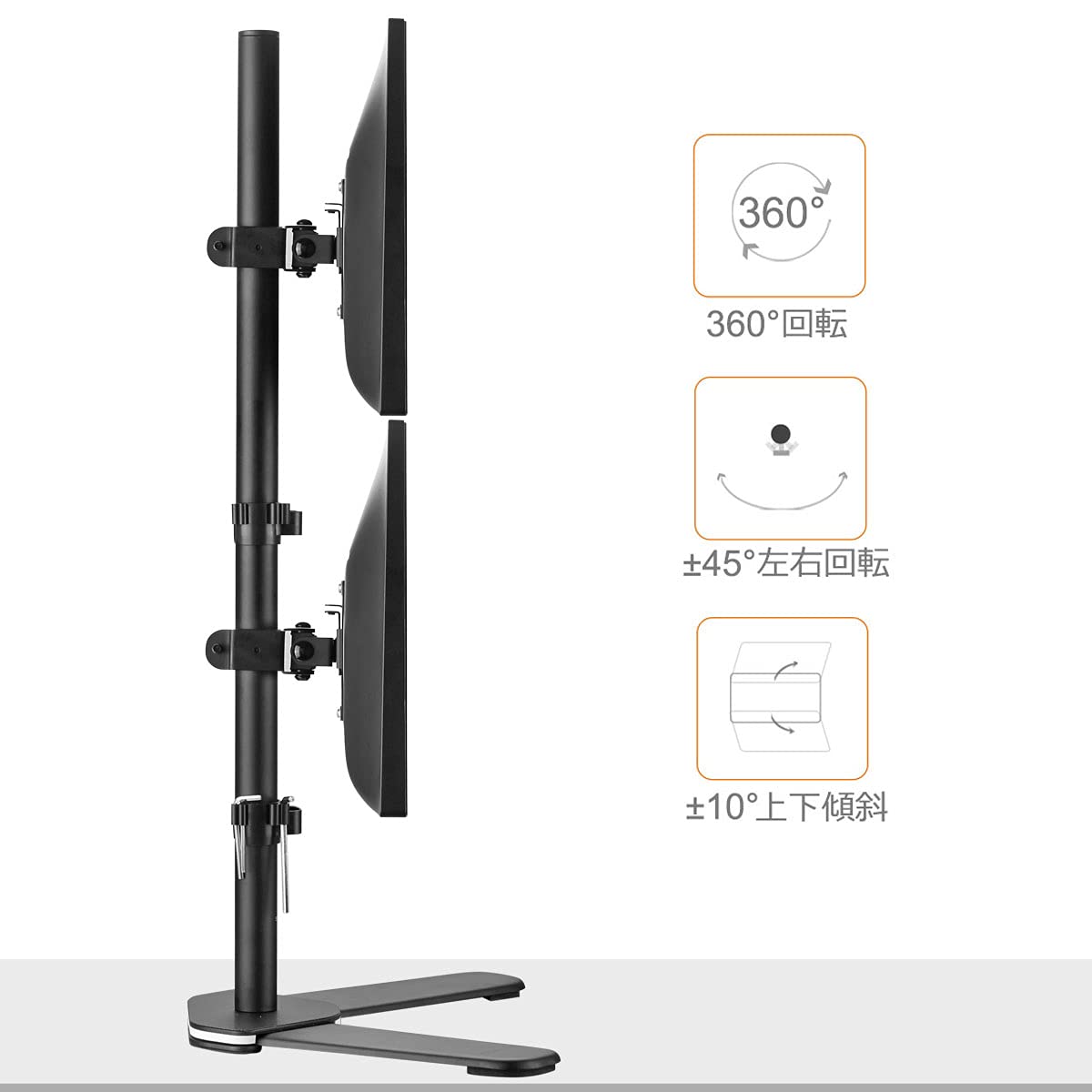 商品情報商品の説明主な仕様 【対応モニター】液晶モニターを2画面設置できるデュアルディスプレイアームです。耐荷重は10KG(1台)で、VESA規格は75×75mm/100×100mmで、13~32インチPCモニターに対応します。br【ディスプレイ角度を自由に変えれる】アーム:ポールの接続部分移動で高さ調節(810mm) VESAプレート部:上向き10°、下向き10°、回転360°、左右各45°。角度や距離などが自分に合って、前後左右に加えて上下も好みの位置に軽々と動かすことができます。ビジネスでの利用はもちろん、トレーダーやゲーマーの方にもおすすめです。 ご注意:付属の六角レンチでボルトを締めて傾斜角度を固定します。一方のモニターが低い場合は、ナットを取り外し、付属の六角レンチでボルトを反時計回りに回してモニターを上げます。調整後、ナットを取り付けます。br【組立・取付簡単】ベースの取り付け:取付必要なネジ類が全て揃っており、分かりやすい日本語マニュアルも付属され、初心者でも悩まずに取り付け作業ができます。商品の組立てはビデオを参照できます。br【2画面PC作業】モニタースタンドやモニター台の代わり、本デュアルモニターアームは2画面作業することを実現でき、スペースを大きく節約します。また、ケーブルクリップがあるので、ケーブルを簡単に整理&保護し、見た目はスッキリとなります。作業面を解放し、机上スペースを活用し、仕事の効率がアップ!br特殊な構造のモニターには、同梱のネジが合わない場合がありますので、ご購入前にご確認ください。