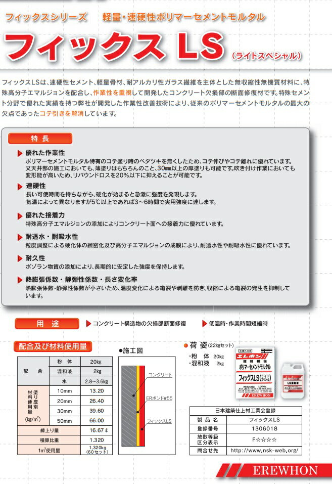 フィックスLS エレホン 22kgセット フィックス工法 軽量 速硬性ポリマーセメントモルタル 粉体 20kg 混和液 2kg エレホン化成工業 041