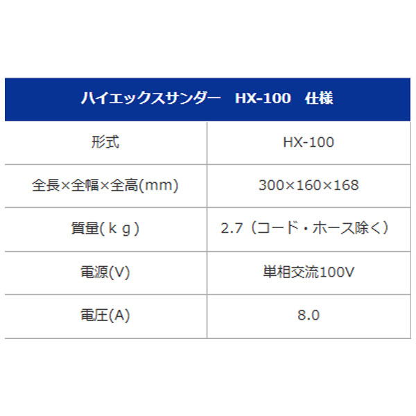 ライナックスのハイエックスサンダー HX-100のページです。 【付属品】 ・ワッシャ×2枚 ・強制排塵ホース(φ32×2m)×1本 ・集じんフィルター袋×3枚 ・ケーブルクランプ×1個 + 【他 工具一式】 ロックナットレンチ×1個 片口メガネレンチ(24mm)×1本 ※カタログなどに記載のある強制排塵ブラシスカート×1組はもともと本体についているもので、予備が付属しているわけではございません。 【特長】 ■集じん機不要、フィルター袋に回収 強制排じんタイプで集じん機は不要。 特殊フィルターはワンタッチで取り付けカンタン! ■粉じん飛散を解消、壁面作業もラクラク ブラシスカートにより、凹凸作業でも粉じん飛散をシャットアウト。 ■強力な排出力、ゴミ詰まりを低減。 特殊強制排じんファンの採用で強力な排出力を実現。 薄膜除去作業でもゴミ詰まりを低減。 【発送について】 メーカー在庫がある場合には翌日発送となります。 在庫がない場合は、発送が遅れる場合がございます。 お急ぎの場合は、注文前に一度確認の連絡をお願いします。 交換カップ ウルトラA NEOウルトラ ウルトラカップシルバー ダイヤカップゴールド ダイヤカップシルバー ダイヤカップフラット ダイヤカップ細目 #100 #200 CS(クッションシステム) CSウルトラカップ CSダイヤカップゴールド CSダイヤカップシルバー CSダイヤカップフラット その他・本体など チーゼルワイスCH-80型 チーゼルワイス用替刃 スリット有無 10枚 20枚 ウルトラサンダー HK-10M クリーンカッター HC-10MK ハイエックスサンダー HX-100ライナックスのハイエックスサンダー HX-100のページです。 【付属品】 ・ワッシャ×2枚 ・強制排塵ホース(φ32×2m)×1本 ・集じんフィルター袋×3枚 ・ケーブルクランプ×1個 + 【他 工具一式】 ロックナットレンチ×1個 片口メガネレンチ(24mm)×1本 ※カタログなどに記載のある強制排塵ブラシスカート×1組はもともと本体についているもので、予備が付属しているわけではございません。 【特長】 ■集じん機不要、フィルター袋に回収 強制排じんタイプで集じん機は不要。 特殊フィルターはワンタッチで取り付けカンタン! ■粉じん飛散を解消、壁面作業もラクラク ブラシスカートにより、凹凸作業でも粉じん飛散をシャットアウト。 ■強力な排出力、ゴミ詰まりを低減。 特殊強制排じんファンの採用で強力な排出力を実現。 薄膜除去作業でもゴミ詰まりを低減。 【発送について】 メーカー在庫がある場合には翌日発送となります。 在庫がない場合は、発送が遅れる場合がございます。 お急ぎの場合は、注文前に一度確認の連絡をお願いします。 交換カップ ウルトラA NEOウルトラ ウルトラカップシルバー ダイヤカップゴールド ダイヤカップシルバー ダイヤカップフラット ダイヤカップ細目 #100 #200 CS(クッションシステム) CSウルトラカップ CSダイヤカップゴールド CSダイヤカップシルバー CSダイヤカップフラット その他・本体など チーゼルワイスCH-80型 チーゼルワイス用替刃 スリット有無 10枚 20枚 ウルトラサンダー HK-10M クリーンカッター HC-10MK ハイエックスサンダー HX-100