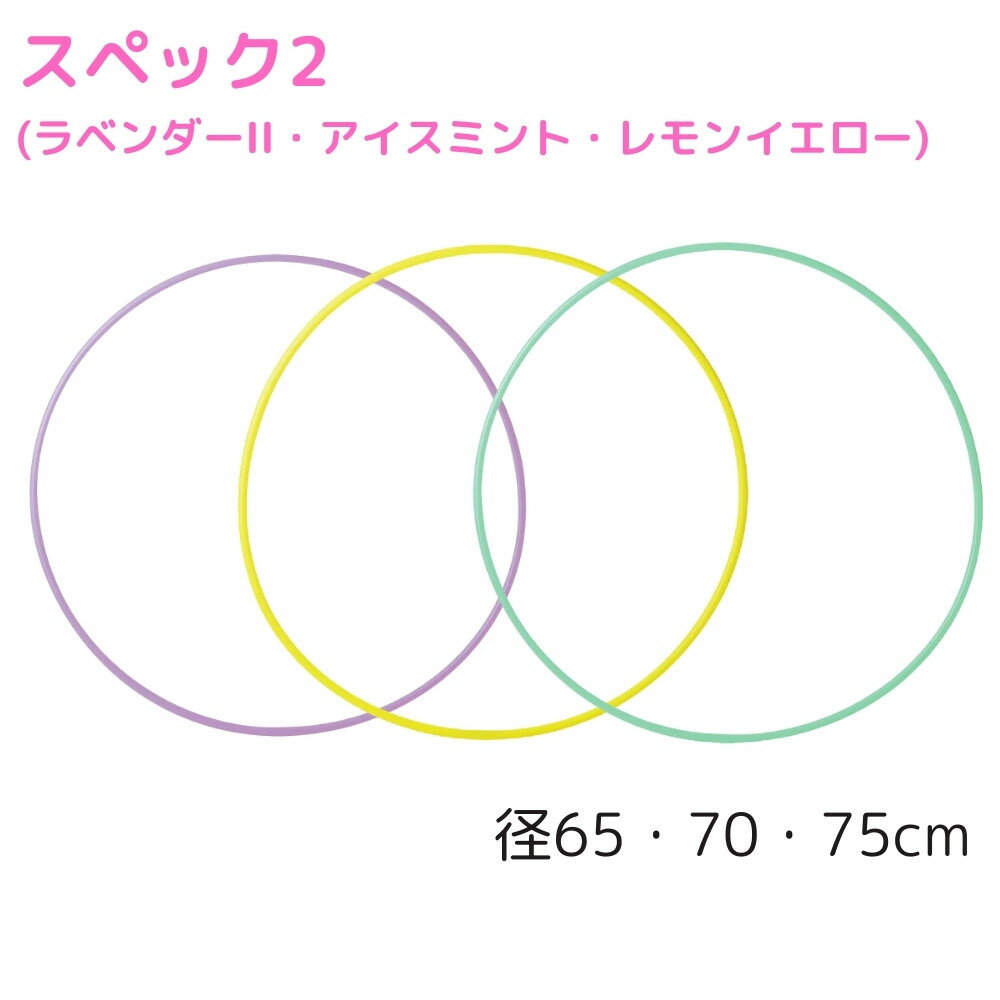 商品情報 [ 商品詳細 ] ●手軽に使用できるスタンダードフープに新色 ICMI(アイスミント)ができました。 ※検定品ではありません ・ 画面上のカラーと実物のカラーが微妙に異なることがございます。 ・ 商品の仕様は、予告無く変更することがございますので、あらかじめご了承ください。 ※商品によって、お選びいただいたカラーと異なるテープで繋ぎ目が固定されております。 こちらははがしてお使いいただくものではありません。(メーカー確認済み) ●素材/ ポリエチレン ●原産国/- [ カラー ] W(ホワイト)P(ピンク)LEY(レモンイエロー)LDII(ラベンダー)ICMI(アイスミント) [ サイズ ] カラー:W(ホワイト)/P(ピンク)60〜90サイズ LEY(レモンイエロー)/LD II(ラベンダー)/ICMI(アイスミント)65 65 70cmのみ [ 注意 ] ■フープ取り扱いのお願い 新体操の演技に十分耐えうる柔軟性を持つ塩化ビニールまたはポリエチレンを使用していますが、過度の衝撃を断続的に与えると破損する場合があります。 ・ご使用はフロアマットの上でお願いします。 ・こん棒など堅い物にぶつけないでください。 ・高温になる場所での長時間保管や、無理な形のままでの保管はお避けください。 メーカー希望小売価格はメーカーカタログに基づいて掲載しています