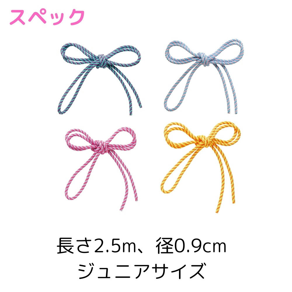 商品情報 [ 商品詳細 ] ●やわらかで、しなやか。ジュニアが扱いやすいロープです。 ●素材/ ポリエステル [ カラー ] KEO×Y:蛍光オレンジ×イエロー P×LD:ピンク×ラベンダー LIBU×LIP:ライトブルー×ライトピンク ICMI×VI:アイスミント×バイオレット [ サイズ ] 長さ2.5m、径0.9cm [ 備考 ] ※検定マークはつきません ロープの長さを短く調節する場合、 1.切断したい個所に必ずテープを巻いてください。 2.その上を切ってください。テープで止めずにそのまま切ると元の形に戻らなくなります。 メーカー希望小売価格はメーカーカタログに基づいて掲載しています