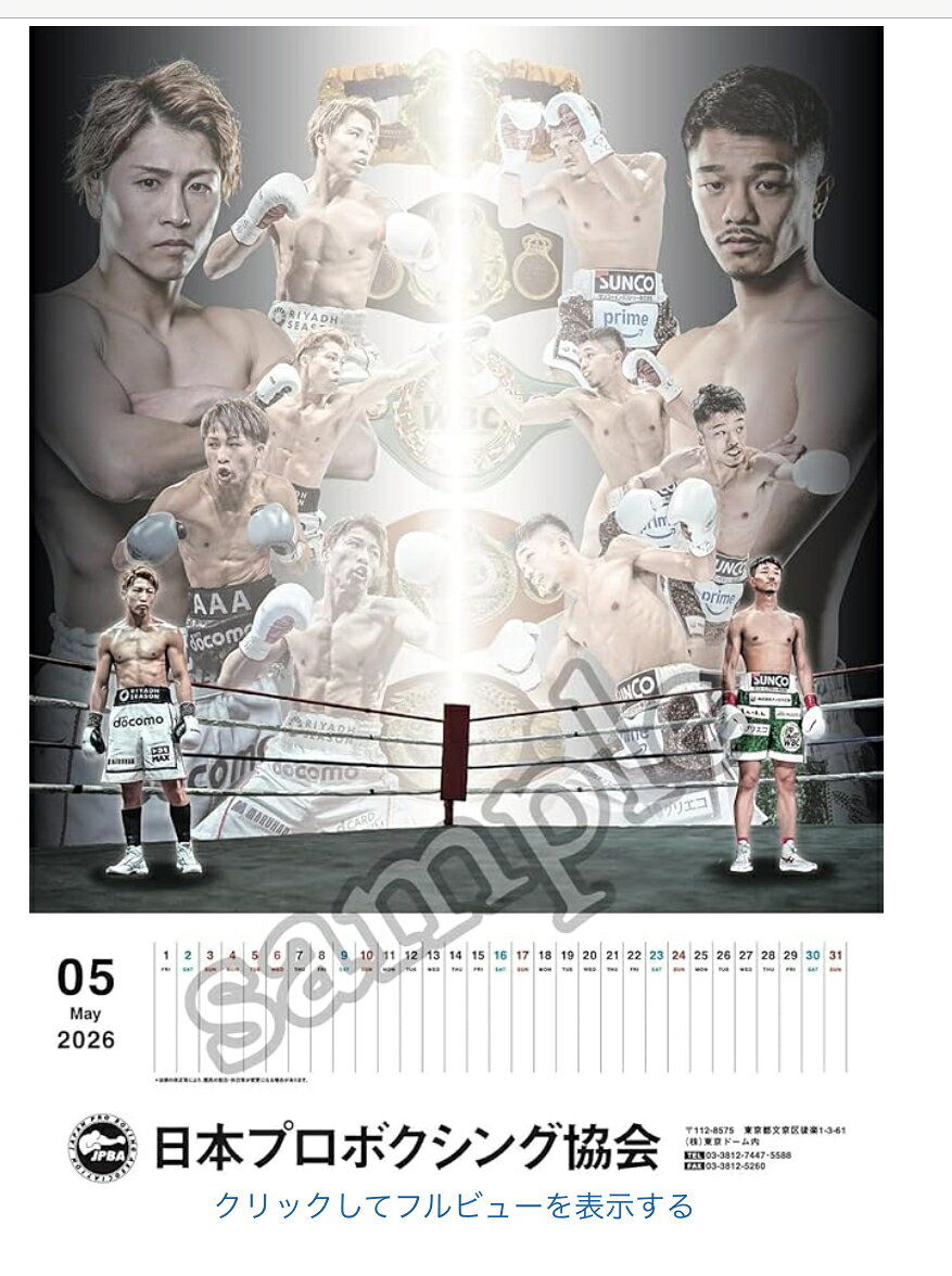 『日本プロボクシング協会カレンダー』の2025年度版です。 日本プロボクシング協会(JPBA) 2026年公式カレンダー! 今回注目の5月ページは、同月に予定される井上尚弥選手(大橋)vs中谷潤人選手(M.T)による ビッグマッチを彷彿とさせる仕上がりとなっております。 そのほか、世界王者、日本王者、東洋太平洋王者、アジアパシフィック王者、ユース王者, さらに現役の元王者まで、各階級のスター選手が勢ぞろいした充実の内容でお届けします。