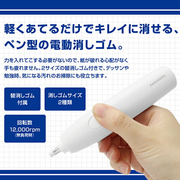 KARUKESHI 電動ペン型消しゴム 毎分12,000回転する電動消しゴム! 細かい汚れもかるーく消せる♪ ◆電動だからラクラク消せる◆ 細かな部分もピンポイントでキレイに! 消しゴムが毎分約12,000回転するので、 力を入れずにキレイに消せます。 軽くあてるだけなので 紙が破れる心配がなく、手も疲れません。 ◆消しゴム2種◆ 用途に合わせて使える2種類の消しゴムが付属 ・消しゴム(太)・・・約φ5mm ・消しゴム(細)・・・約φ2.3mm ◆ペン型タイプ◆ 鉛筆のように持てるスリムなペン型タイプ。 筆箱やペンケースにも入ります。 ◆保護カバーつき◆ 使用後は本体先端部にある、 消しゴムの保護カバーを引き上げて清潔に保管が可能です。 ◆いろいろなシーンに使えて便利◆ デスク周りや壁などの汚れ落とし、 勉強や仕事場、イラストにもおすすめ◎ 通常の消しゴムより細かく消せるのでとっても便利♪ ■ 商品仕様 ■ サイズ 本体サイス:約W2.5×D2.5×H13cm パッケージサイズ:約W10.5×D2.5×H19cm 重量 本体重量:約40g 総重量:約80g 材質 ABS、PP、ステンレス 電源 乾電池式/単4形アルカリ乾電池2本(別売) 回転数 約12,000rpm(無負荷時) セット内容 本体(保護カバー付き) 消しゴム(太) 約φ5mm×10本 消しゴム(細) 約φ2.3mm×10本 ホルダー×2個 ■ ご注意 ■ ※ 必ず消しゴムをセットしてから稼働してください。 ※ 本体に水をかけたり、水につけたりしないでください。防滴・防水ではありません。 ※ 湿気の多い場所、直射日光の当たる場所への保管・放置はしないでください。 ※ お手入れの際、シンナー・ベンジン等の揮発性有機溶剤は使用しないでください。 ※ この製品は一般家庭用です。業務用での使用はご遠慮ください。 ・ 掲載画像はイメージであり、実際の製品とは多少異なる場合があります。 ・ パッケージや個装形態は入荷時期によって変更となる場合があります。 ・ 製品の仕様は品質の向上・改善のため、予告なく変更となる場合があります。