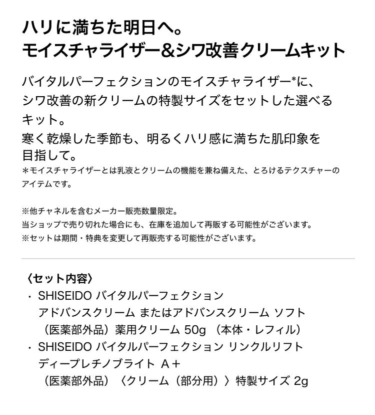 * モイスチャライザー:乳液とクリームの機能を兼ね備えた、とろけるテクスチャーのアイテムです。 * 紅花 RED:保湿:ベニバナエキス、グリセリン * 複合的な肌悩み:乾燥・ハリのなさなど * 4MSK:4−メトキシサリチル酸カリウム塩 弾むようなハリつやで上向き印象へ 薬用クリーム肌*の回路を拓き、しなやかに。生きいきと弾むようなハリ・つやで、若々しい上向き印象へ。有効成分を網の目のように行き渡らせて、ハリや輝きに影響を与えるエイジングケアのための薬用クリーム。密度を感じるようなハリのあるつややかな肌へ導きます。エイジングケアとは、年齢に応じたうるおいケアです。乾燥による小ジワを目立たせなくします。(効能評価試験済み)*角層使用方法●朝、夜のお手入れの最後に、指先にパール粒2コ分を目安にとり、なじませます。<レフィルの交換方法>●使い終わった本体容器を片方の手でおさえながら、内側容器の口もとの2ヶ所にある突起部分に指をかけ、やさしく上に引き抜きます。●レフィルを容器に入れ、上からしっかりと押し込みます。●レフィルの密封シールを完全にはがしてから、容器のキャップを閉めてください。販売名バイタルパーフェクション アドバンスクリームバイタルパーフェクション アドバンスクリーム ソフト商品区分医薬部外品内容量50g商品サイズ◆本体幅70mm×高さ76mm×奥行き70mm◆レフィル幅53mm×高さ47mm×奥行き53mm原産国日本成分(原材料)バイタルパーフェクション アドバンスクリーム 全成分はこちら> バイタルパーフェクション アドバンスクリーム ソフト 全成分はこちら> 使用上の注意◇ご使用後は容器の口もとをきれいに拭き、必ずキャップをきちんと閉めてください。◇日のあたるところや高温のところにおかないでください。◇必ずレフィルを本体容器にセットしてから、密封シールをはがしてください。◇密封シールをはがす際には、手を切らないようご注意ください。◇前の容器に残った中味を、レフィルに移し替えないでください。◇容器にキズが生じたりキャップの開閉がきちんとできなくなった場合は、新しい本体容器にお取替えいただくことをおすすめします。メーカー・販売業者・広告文責資生堂ジャパン (SHISEIDO JAPAN)050-5433-8489