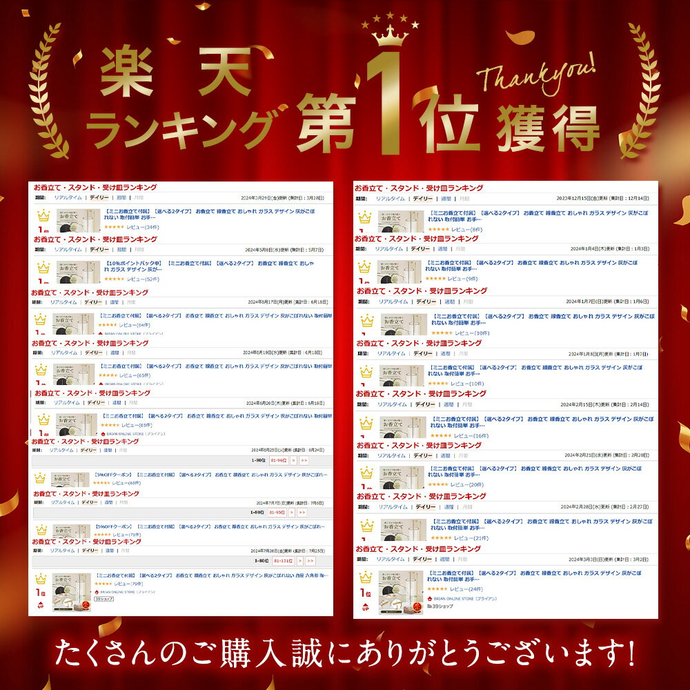 商品情報品名選べる3種のお香立て・六角形台座・円形台座・四角形台座特徴・取り付け簡単線香に火をつけ、ホルダーにセットし微調整するだけの簡単取付。・飛び散らない灰ガラスコップの深さは約20cm。灰がそのままコップの中に落ちますので、灰が飛び散る心配もありません。お手入れ不要で、溜まった灰はそのままゴミ箱へ捨てるだけ。・お手入れ簡単ガラス部分は取り外し可能です。汚れたら水洗いするだけ。・厳選された天然木を使用木製台座は厳選されたクルミの天然木を使用。クルミ木材には優しい穏やかな雰囲気があり、美しい外観で耐久性にも優れています。・おしゃれなデザインモダンでスタイリッシュなデザインで、置くだけで素敵なインテリアにも。木製台座はおしゃれな六角形。・ミニ線香立て付属お香を立てて使用した場合には、付属のミニお香立てをご利用いただけます。厚さ約1cm幅約2cmの超コンパクトなサイズなので、持ち運びに便利です。線香の差込口は、全部で3穴。1列ずつ太さが異なっており、3種類の太さに対応していますので、複数のお香を同時に設置可能です。・様々なシーンで活躍お部屋のリビングルームや寝室、和室、玄関などにちょうど良く、ヨガルームやオフィス・カフェ・アウトドアなど様々なシーンで活躍します。種類ホルダータイプ1・ホルダータイプ2素材本体:ガラス(高ホウ素シリコンガラス150℃まで対応)台座:木製(胡桃)原産国中国関連ワードお香立て 線香立て おしゃれ ガラス デザイン 灰がこぼれない 台座 六角形 円形 四角形 取付簡単 お手入れ簡単 天然木使用 クルミ木材 耐高温 インセンスホルダー モダン スタイリッシュ ミニお香立て付属 選べる2タイプ【インテリア専門家×作業療法士 W監修】 お香立て 線香立て おしゃれ ガラス デザイン 灰がこぼれない 台座 六角形 円形 四角形 ミニお香立て付属 取付簡単 お手入れ簡単 天然木使用 クルミ木材 耐高温 インセンスホルダー モダン スタイリッシュ 【楽天ランキング1位獲得】 モダン スタイリッシュ インセンスホルダー 香炉 インテリア リビング 寝室 茶室 和室 玄関 ヨガ カフェ アウトドア 台座 六角形 円形 四角形 2