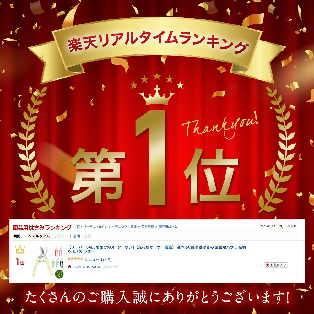 商品情報商品名選べる6色・剪定ばさみ重量約88gサイズ本体:17.5cm×4.5cm刃長:4.5cmはさみの開口幅:2.5cm材質はさみ部分:ステンレス鋼持ち手部分:ABSハンドル広告文責ティアーモ株式会社 050-3174-4043原産国中国関連ワード切れ味抜群 剪定ばさみ 握りやすい 枝切挟 ハサミ 園芸 ガーデニング 園芸用 植物 ガーデニングハサミ ガーデニング用品 ステンレス バサミ 園芸はさみ 切り花 切花 家庭菜園 選べる6色 剪定ばさみ 滑り止めハンドルつき 剪定はさみ 軽い 握りやすい 枝切挟 ハサミ 園芸 ガーデニング 園芸用 植物 ガーデニングハサミ ガーデニング用品 ステンレス バサミ 園芸はさみ 切り花 切花 家庭菜園 元花屋オーナー推薦【元花屋オーナー推薦】 選べる6色 剪定ばさみ 園芸用ハサミ 枝切りはさみ 小型 軽量 安全ロック付 女性 握りやすい ステンレス 園芸ばさみ 剪定はさみ 枝切挟 ガーデニングハサミ 家庭菜園 園芸 植物 庭木 植木 果樹用 花ばさみ 【元花屋オーナー フラワーデザイナー推薦】切れ味抜群 剪定ばさみ 握りやすい 枝切挟 花ばさみ 花はさみ 花 はさみ 園芸 ガーデニング 植物 ガーデニングハサミ ステンレス 家庭菜園 2