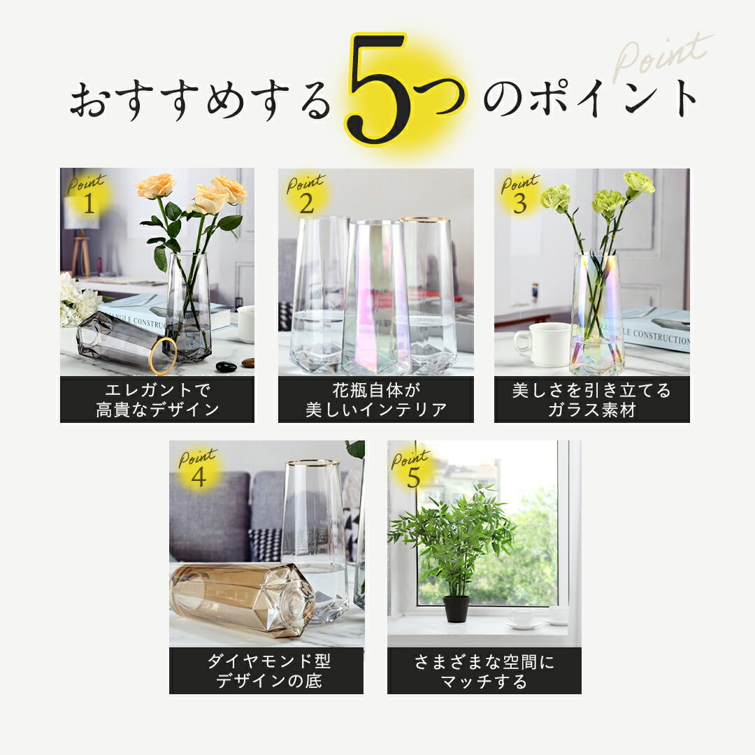 商品情報品名選べる6色 北欧風 ダイヤモンド型デザイン ガラス 花瓶特徴1、エレガントで高貴なデザイン置くだけで上品で高級な雰囲気を醸し出し、また日常を華やかに彩ります。2、花瓶自体が美しいインテリア花を挿さずに飾るだけでもインテリアにアクセントを加えます。3、美しさを引き立てるガラス素材水の透明感や光が加わることで花全体の見た目が一層美しくなります4、ダイヤモンド型デザインの底花瓶の底は高級感のあるダイヤモンド型デザイン美しいだけでなく厚みもあり安定感があります。5、様々な空間にマッチリビングルーム・ベッドルーム・窓際・玄関など様々な場所に馴染みます。素材ガラス製原産国中国検索ワード選べる6色 北欧風 ガラス 花瓶 フラワーベース シンプル モダン 上品 おしゃれ グレー アンバー レインボー クリア 金口飾りグレー 金口飾りクリア 高級感 高貴 エレガント ダイヤモンド型デザイン 花器 インテリア 花びん 生け花 オブジェ リビング 寝室 玄関 書斎 窓辺 雑貨【お買い物マラソン限定 20%OFFクーポン】 【選べる6色】 北欧風 ガラス 花瓶 フラワーベース 21.5cm シンプル モダン 上品 おしゃれ アンバー クリアー グレー レインボー 金口飾りグレー 金口飾りクリア 高級感 高貴 エレガント ダイヤモンド型デザイン 花器 インテリア 北欧風 ガラス 花瓶 フラワーベース アンバー クリアー グレー レインボー 金口飾りクリア 2