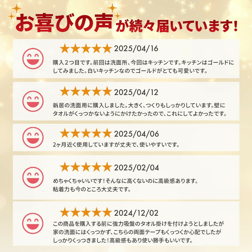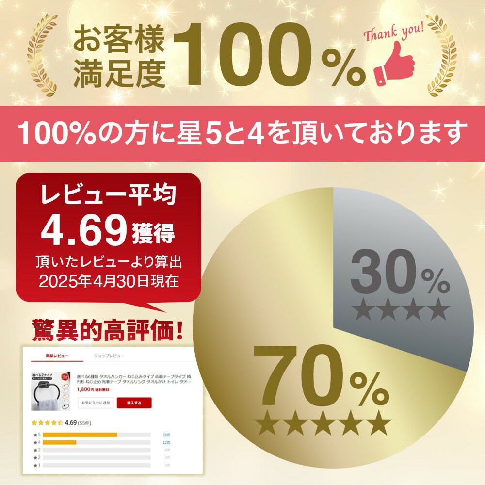 商品情報商品名タオルハンガータイプ・ねじこみ式タイプ・両面テープタイプカラー・ブラック・ゴールド・シルバー(色味は艶のないマットな仕上がりです)特徴1.シンプルなデザインシンプルなデザイン。上質な雰囲気を演出2.選べる2タイプねじこみ式:取付金具が付属。しっかり固定、長期的に利用したい場合に。両面テープ:強力な両面テープが付属。賃貸や穴あけができない場所に最適。3.タオルが広く掛けられる形幅が広いデザイン。タオルがかさばらず衛生面でも安心。4.180度回転可能タオルハンガーは180度自由に回転します。お好みの角度でご利用いただけます。5.錆びにくいステンレス素材ステンレスは他の一般的な金属に比べ耐久性に強く錆びにくい。6.様々なシーンで活躍キッチン、トイレ、洗面所、バスルームなど、様々な場所にご利用いただけます。素材ステンレスサイズ横幅:約20.2CM(共通)台座:ねじこみ式(奥行約5cm×横約5.5cm)台座:両面テープタイプ(奥行約4.5cm×横約10cm)広告文責ティアーモ株式会社 050-3174-4043原産国中国製関連ワード選べる6種類 2タイプ タオルハンガー タオルリング タオルかけ トイレ タオルフック タオルホルダー ゴールド 黒 シルバー ねじ止め ねじ込み シンプル 上質 ねじ込みタイプ 両面テープタイプ 楕円形 粘着テープ【お買い物マラソン限定 10%OFFクーポン】 選べる6種類 タオルハンガー ねじ込みタイプ 両面テープタイプ 楕円形 ねじ止め 粘着テープ タオルリング タオルかけ トイレ タオルフック タオルホルダー ゴールド 黒 シルバー シンプル 上質 選べる6種類 タオルハンが― 2
