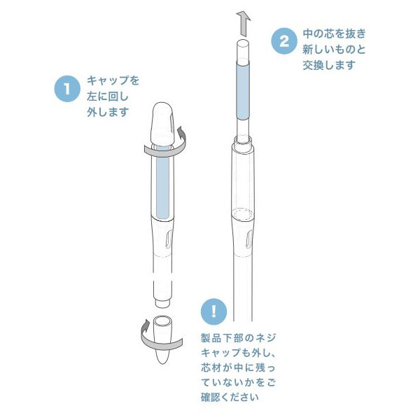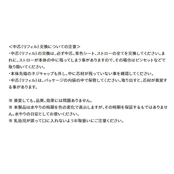 ■サスティSサイズ用の交換リフィル2本セットです。 ■土壌の環境によりますが、水をあげても青く変わらなくなったら交換時期です。(約6~9ヶ月が目安) ●交換は、たったの2ステップ。誰にでもカンタンに行えます。 1.キャップを左に回します。 2.中の芯を抜き新しいものと交換します。 【中芯(リフィル)交換についての注意】 ・中芯(リフィル)の交換は、必ず中芯、青色シート、ストローの全てを交換してください。まれに、ストローが本体の中に残ってしまう事がありますので、その場合はピンセットなどで取り除いてください。 ・本体先端のネジキャップも外し、中に芯材が残っていない事を確認してください。 ・中芯(リフィル)は、パッケージの内袋の中で保管してください。取り出すと、芯材が黄変する事があります。 ・中に汚れや土がつまっていたら、新しい中芯(リフィル)を入れる前に水洗いしてください。 ※黄変しても、品質、効果に問題はありません。 ※本製品は水やりの時期を色の変化で表示しますが、その時期を保証するものではありません。水やりの目安としてお使いください。 ※乳幼児が誤って口に入れないようにお取扱いにご注意ください。