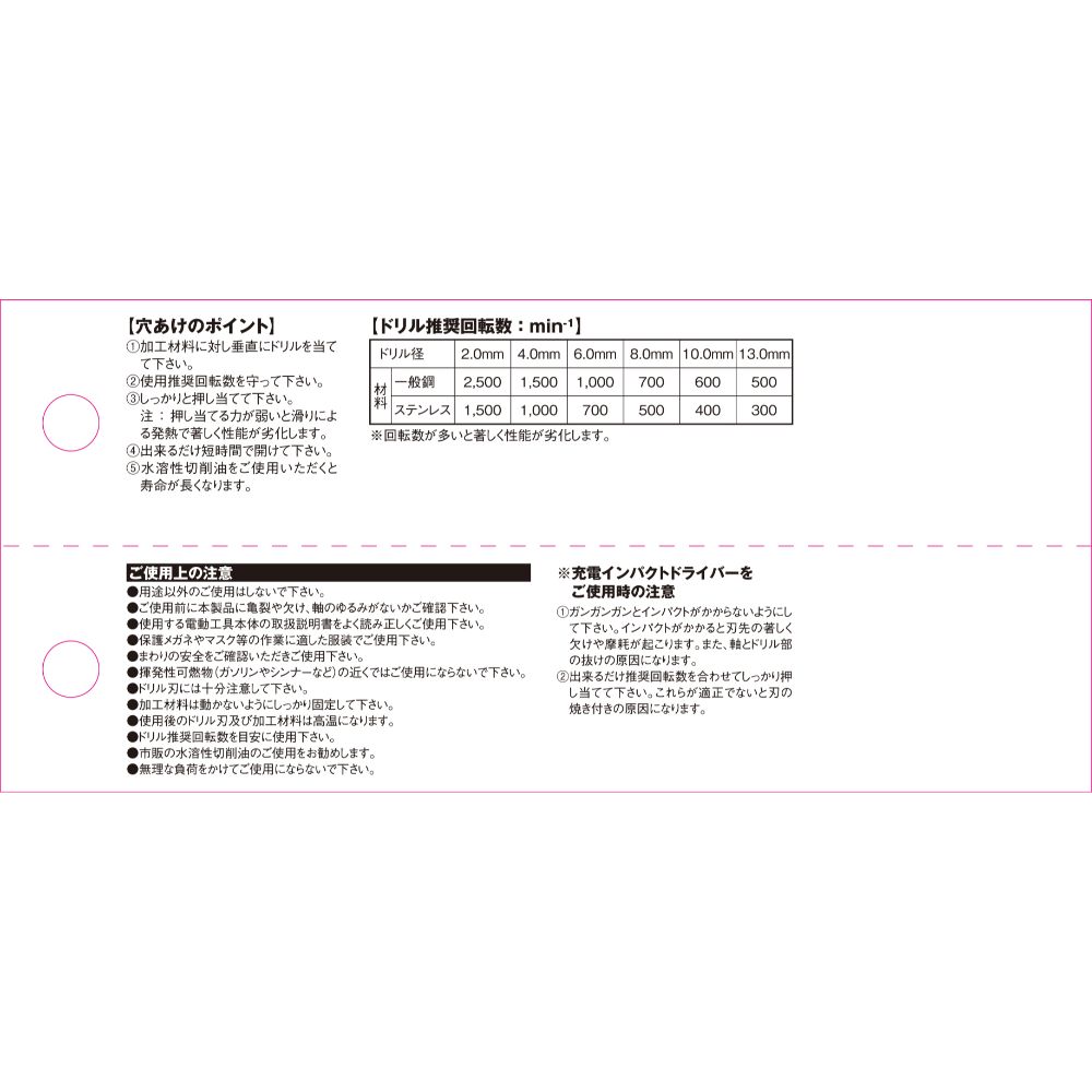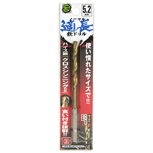 使い慣れたサイズ、ハイス鋼クロスシンニング刃先で食い付き抜群の適長鉄ドリルです。鉄、木、樹脂、軽金属の穴あけ。ハイス鋼(HSS)にチタン(Tin)をコーティング、耐熱性能が上がり長寿命です。六角軸なのでインパクトドライバーなどのチャックに直接セットできます。クロスシンニング刃先で食い付き抜群です。サイズ:幅7×高さ106×奥行7mm重量:15gサイズ:5.2mm標準穴あけ可能厚:(鉄)2.0mm・(木)らせん溝長の2/3程度軸:六角軸6.35mm使用電動工具:充電式インパクトドライバー・ドリルドライバー・電気ドリル加工材料:鉄・木・樹脂・軽金属※用途以外のご使用はしないで下さい。ご使用前に本製品に亀裂や欠け、軸のゆるみがないかご確認下さい。使用する電動工具本体の取扱説明書をよく読み正しくご使用下さい。※保護メガネやマスク等の作業に適した服装でご使用下さい。まわりの安全をご確認いただきご使用下さい。揮発性可燃物(ガソリンやシンナーなど)の近くではご使用にならないで下さい。※ドリル刃には十分注意して下さい。加工材料は動かないようにしっかり固定して下さい。使用後のドリル刃及び加工材料は高温になります。ドリル推奨回転数を目安に使用下さい。市販の水溶性切削油のご使用をお勧めします。無理な負荷をかけてご使用にならないで下さい。