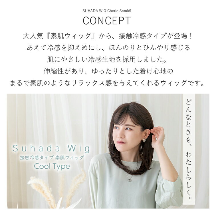 商品番号: hf1958 商品説明: リラックスタイムに最適なウィッグ『素肌ウィッグ』から、接触冷感タイプが登場いたしました。 ウィッグを着用するとき、窮屈感、暑苦しさ、肌触りの悪さなどのストレスを感じた事はありませんか? 【素肌ウィッグ】は そういった、ウィッグをかぶる際に生じるストレスを少しでも軽減できるように開発されたウィッグです。 まるで、素肌で過ごしているようにストレスフリー。 ポイントは、素材と、着用感。 ウィッグ内側のキャップ部分をなるべく縫い目の段差を感じにくいフラットな構造にしているため、 不快感を軽減してくれます。 付属のネットを使って着用頂けますが、素肌に触れても優しい素材ですので、ネットを使わずそのままでも着用して頂けます。 「強すぎる冷感生地は苦手」「化学由来の繊維は肌が荒れる」 という声をよくお聞きします。 あえて冷感を抑えめにし、ほんのり、ひんやりと感じる冷感生地を採用しました。 原料には綿と、天然素材コットンリンターを原料とした「キュプラ」という再生繊維を使用し、 「肌に優しい接触冷感」を実現しました。 また、全体的にゆったりしたサイジングにすることで、締め付け感を軽減。 長時間の着用でもご負担になりにくく、ゆったりしたおうち時間や ちょっとしたお出かけ、旅行時のサブウィッグとしてなど 様々なシーンで活躍してくれます。 スタイルは幅広い方々から人気の高い、 大人気ウィッグ【商品番号:hf1573 シェリーセミディ】のスタイルを元に、素肌ウィッグの構造に作り替えた商品です。 肩から鎖骨あたりの長さで、扱いやすく、リラックスタイムにも邪魔にならない丁度よいレングス。手ぐしでするっとまとまり、清楚な印象を与えてくれるストレートヘアです。 全体にレイヤーが入り、かぶり心地もとても軽いので1日かぶっても疲れにくいのが嬉しいポイント。 無造作にくしゃっとしてみたり、毛先を外はねにしてまた違う雰囲気を楽しむのもオススメです。 また、つむじはかぶったとき、若干左に位置するななめつむじデザインで 自然な毛流れを表現してあり、ふわっとしたボリューム感も出しやすい構造。頭頂部がペタッとしてしまい、不自然になるのを軽減してくれます。 注意事項:・初めてブラッシングをされる場合、毛が抜け落ちますが、品質には問題ございません。 ・ふんわりと自然に見えるように、根元にふかし加工を施しています。不良品ではございませんのでご安心ください。 ・接触冷感の感じ方には個人差がございます。(接触冷感とは、触れた際にひんやりとした冷たさを感じる素材です。持続性はございません。) ・写真と実物の色が液晶の具合によって若干異なることがあることをご了承ください。 ・製品の品質向上のため、製品の仕様は、予告なしに若干の変更がされる場合があります。 関連検索: ブライトララ 素肌ウィッグ 医療用ウィッグ ウィッグ ミディアム セミロング 医療ウィッグ かつら かぶるだけ ウイッグ フルウィッグ 冷感 夏 夏用 暑さ対策 ひんやり ルーム 自宅用 おうち用 リラックス 締め付けない 緩め 帽子 柔らか 綿 コットン キュプラ 敏感肌 楽 自然 バレない 医療用 抗がん剤 黒 茶 脱毛症 薄毛 女性 レディース 普段使いBrightlele hf1958 素肌ウィッグ 接触冷感 シェリーセミディ のスタッフおすすめポイント 窮屈感や違和感を軽減させる事にこだわった、リラックスタイムに最適なウィッグ『素肌ウィッグ』から、接触冷感タイプが登場いたしました。 【素材】ウィッグキャップの原料には綿と、天然素材コットンリンターを原料とした「キュプラ」という再生繊維を使用し、「肌に優しい接触冷感」を実現しました。 【スタイル】肩から鎖骨あたりの長さで、扱いやすく、リラックスタイムにも邪魔にならない丁度よいレングス。手ぐしでするっとまとまり、清楚な印象を与えてくれるストレートヘアです。 状 態 新品未使用 ウィッグ専用ネット付き 毛 材 耐熱人工毛 髪の長さ 後髪:約48cm 前髪:約13cm レイヤー:約40cm つむじ 人工頭皮あり/I型ななめつむじ 重 量 150g サイズ Sサイズ:約48cmから55cm Mサイズ:約51cmから58cm アジャスターでサイズ調整可能※ウィッグに伸縮性がある為、表記サイズより多少誤差があります。 デザイン・発送元 日本 製 造 中国 その他 I型つむじ 金属クリップ不使用シャンプー可能ドライヤー、コテ、アイロン等で好みの髪型に整えることができます。「耐熱温度最大180度」」※1 ※1 詳しくは「よくある質問のページ(コテ、アイロン、ドライヤーの使用についての質問項目)」をご参照下さい。