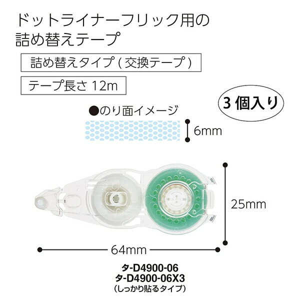 コクヨ テープのり ドットライナーフリック つめ替え用テープ 3個パック 6mm幅 12m巻 強粘着 コンパクト タ-D4900-06X3 - 送料無料※800円以上 メール便発送