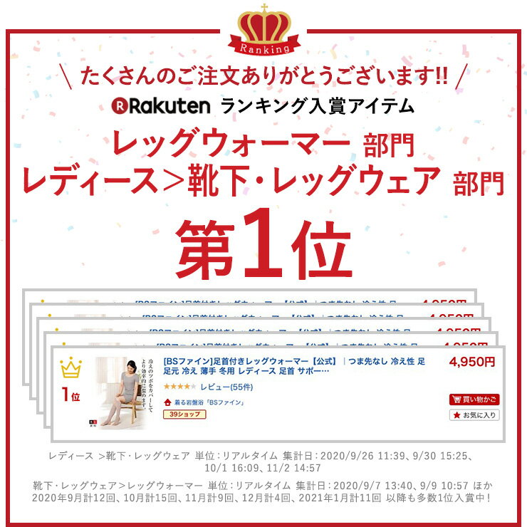 足元の「冷え・疲れ」でお悩みの方におすすめです。締めつけることなくふくらはぎや足首の冷えを、足湯のように心地よく温めます。 温かい場所や、ブーツを履いても蒸れません。 就寝時に着用すると足元から身体がポカポカ温まります。立ち仕事やご旅行時に大好評です。 今回、レッグウォーマーをご愛用中のお客様から最も多くのご要望をいただいていた「足首付き」のレッグウォーマーを新改良してご用意! 甲部分の長さを新改良してより温かさがアップしました。従来のレッグウォーマーと同じく、優しい着け心地はそのまま、 足首にある冷えのツボをすっぽりカバー! 使用している「プレミアム生地」は、最も伸びやかで厚みのある、スーパーフライス生地です。 伸縮性が高いため、ふくらはぎに優しくフィットし締めつけず快適にご着用頂けます。 ◆ 1足組はこちら ◆ ◆ <当店人気No.1>足首なし通常サイズはこちら◆ ◆ 足首なしロングサイズはこちら ◆ 商品詳細 サイズ F(長さ48cm/膝下周り24cm〜35cm) LL(長さ48cm/膝下周り28cm〜40cm) カラー ブラック・グレー・ピンク 素材 綿58%、ポリエステル40%、ポリウレタン2% 製造販売元 加茂繊維株式会社(BSFINE) 日本製 ※男女兼用◆ BSファインのレッグウォーマーラインナップ ◆ レッグウォーマー 1足 税込 4,400円 2足組 税込 7,700円 BSファイン人気NO.1! 冷えてつらい足元の冷えを心地よい足湯のようにじんわり温めます。 ◇プレミアム生地 ナノレッグウォーマー 税込 4,950円 じんわり温め、しっとり保湿。保水力と密着性が高くズレ落ちと保湿力がUPした新感覚のナノレッグウォーマーです。 レッグウォーマーロング 1足 税込 5,500円 2足組 税込 9,900円 冷えるとつらい膝関節までをじんわり温めるロングタイプです。 ◇プレミアム生地 足首付きレッグウォーマー 1足 税込 5,500円 2足組 税込 9,900円 足首の冷えがつらい方のために開発。冷えるとつらい足首から甲までじんわりポカポカ温めます。 ◇プレミアム生地
