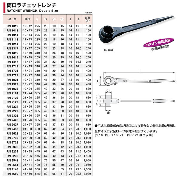 商品情報 メーカー スーパーツール品番 RN-2126規格サイズ 21x26mm仕様・スペック 材質:特殊合金鋼仕上げ:カチオン電着塗装切換爪の窓があいているので、砂などがかんだ時にも洗浄が簡単です。安全ロープ取付穴を設けています。バリエーション 10mmx12mm(RN1012)10mmx13mm(RN1013)10mmx14mm(RN1014)11mmx13mm(RN1113)12mmx14mm(RN1214)13mmx17mm(RN1317)13mmx19mm(RN1319)14mmx15mm(RN1415)14mmx17mm(RN1417)17mmx19mm(RN1719)17mmx21mm(RN1721)17mmx22mm(RN1722)19mmx21mm(RN1921)19mmx22mm(RN1922)19mmx24mm(RN1924)21mmx24mm(RN2124)21mmx26mm(RN2126)21mmx27mm(RN2127)22mmx24mm(RN2224)22mmx27mm(RN2227)23mmx26mm(RN2326)24mmx26mm(RN2426)24mmx27mm(RN2427)24mmx30mm(RN2430)26mmx32mm(RN2632)27mmx30mm(RN2730)27mmx32mm(RN2732)30mmx32mm(RN3032)32mmx35mm(RN3235)32mmx36mm(RN3236)35mmx41mm(RN3541)36mmx41mm(RN3641)41mmx46mm(RN4146)46mmx50mm(RN4650)スーパーツール 防サビ効果抜群のカチオン電着塗装を施した日本製両口ラチェットレンチ 安全ロープ取り付け穴付仕様 21x26mm RN-2126 サイズバリエーション豊富な国産ラチェットレンチ 2