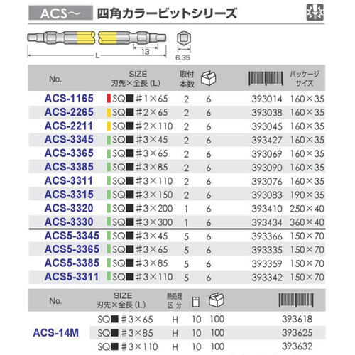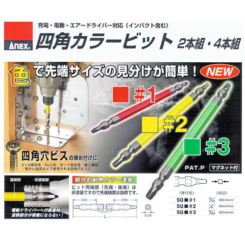 ANEX カラービット 四角ビット 両頭タイプ SQ■#1x65 2本組 建築金具 耐震金具 大工 噛み込み防止 四角穴マグネット付 スクエア インパクト 電動ドライバー 電動用ビット ACS-1165 兼古製作所