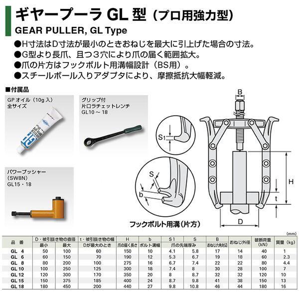 商品情報 メーカー スーパーツール品番 GL-6仕様・スペック 被引き抜き物の直径(mm):60〜150被引抜き物の幅(mm):70爪の届く長さ(mm):190材質:特殊合金鋼付属品:GPオイル(10g)仕上げ:黒染め (めねじ:メッキ)●機械や自動車の解体修理におけるベアリング、プーリ、ギヤー等のあらゆる引抜き作業に最適。●G型より長爪、且つ3穴により爪の届く範囲拡大。●爪の片方はフックボルト用溝幅設計でベアリングセパレーターが使用可能(BS用)●スチールボール入りアダプタにより摩擦抵抗大幅軽減。サイズバリエーション【長爪タイプギヤプーラー】呼び寸法:100mm(GL-4)呼び寸法:150mm(GL-6)呼び寸法:200mm(GL-8)呼び寸法:250mm(GL-10)呼び寸法:300mm(GL-12)呼び寸法:375mm(GL-15)呼び寸法:450mm(GL-18)【超長爪タイプギヤプーラー】呼び寸法:100mm(GLL-4)呼び寸法:150mm(GLL-6)呼び寸法:200mm(GLL-8)呼び寸法:250mm(GLL-10)呼び寸法:300mm(GLL-12)【ベアリングセパレーター】6~60mm対応(BS-1)9~115mm対応(BS-2)6~60mm対応:スピーダー付き(BS-1S)9~115mm対応:スピーダー付き(BS-2S)25~230mm対応(BS-4)サイズバリエーション豊富な日本製高品質ギヤプーラー!専用オイルやサイズによって作業性が上がる付属品も付いたプロ用強力型モデル! 【奥まで届く!長爪タイプの2本爪タイプのギヤプーラー】 2