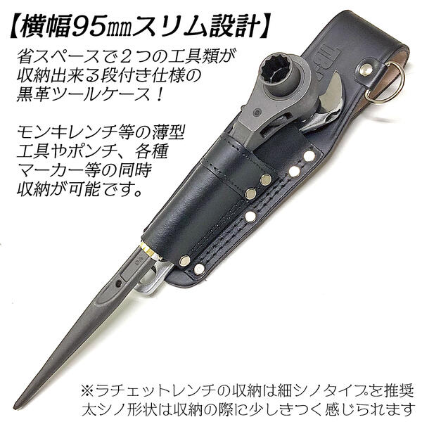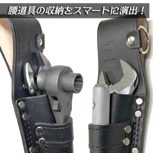 鳶壱 革製工具差し 頑丈2段差しスリムタイプ 補強革付 ラチェットレンチ モンキーレンチ スリム幅 レザーツールケース Dリング付 中空リベット プロ用 鳶 道具 腰道具 燕三条 日本製 LX-20BK LX-20NB LX-20OD TB-1 tobiichi