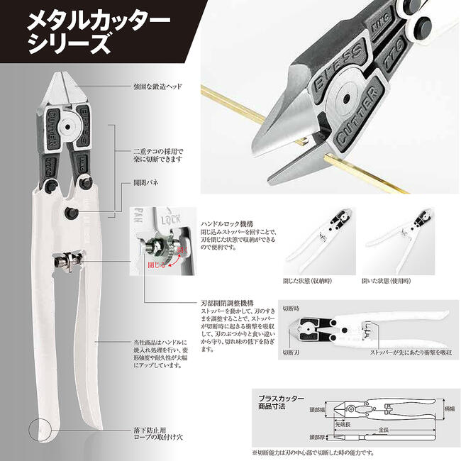 商品情報メーカーツノダ品番PC-1400仕様・スペック【全長】226mm【切断能力】銅線:5.0mm真鍮線:5.0mm■切断面が平たく仕上げられるフラットタイプのストレート刃仕様ジュエリーカッター!●二重テコ構造と先端刃部焼入れで軽い力で楽々線材の切断が可能!●ハンドル部分に特殊処理を施し「頑丈+ガタツキ軽減=長寿命化」を実現!●バネ付きなので連続作業にも便利です。●ハンドルロック機能搭載。刃を閉じた状態で収納できます。●ジュエリー制作に使用する真鍮などの柔らかい金属を軽い力で切断する事ができます。●ロストワックス鋳造のキャストツリーからの切り放しにも最適です。【ご案内】パワーメタルカッターシリーズは従来のゴールドハンドルから、ホワイトの焼付け塗装のグリップに順次変更となります。予めご了承ください。バリエーション【パワーメタルカッター】強力ストレート刃タイプ(PC-1100)エンドニッパータイプ(PC-1200)【パワーブラス(真鍮)カッター】ラウンド刃タイプ[切出し用](PC-1300)フラット刃タイプ[仕上げ用](PC-1400)【ハンドルがホワイトになってリニューアル登場!】二重テコ構造と全体焼入れ刃部で従来品よりも様々な線材が軽快に切れるパワーシリーズ!切り口が平らに仕上がる、最終仕上げに最適なストレート刃仕上げ! 【新潟県の燕三条の老舗作業工具メーカーが仕上げた、切断力抜群のパワーツール!】 2