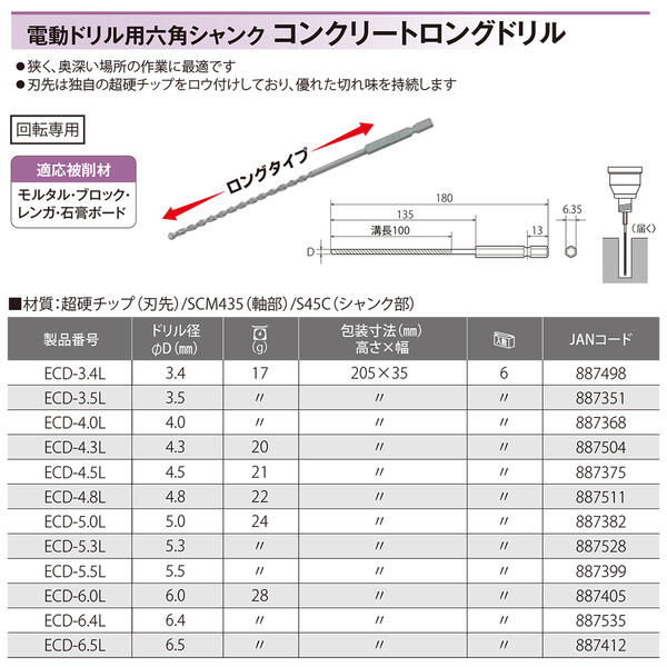 商品情報メーカートップ工業品番ECD-5.3LECD-5.5LECD-6.0L仕様・スペック【ドリル径(mm)】φ5.3mm~6.0mm【ドリル溝長(mm)】100【適応被削材】モルタル・ブロック・レンガ・石膏ボード【材質】超硬チップ(刃先)/SCM435(軸部)/S45C(シャンク部)●モルタル・ブロック・レンガ・石膏ボードの穴あけ作業に。●狭く、奥深い場所の作業に最適です。●刃先は独自の超硬チップをロウ付けしており、優れた切れ味を持続します。●六角シャンク軸だから、インパクトドライバーにワンタッチで取付出来ますサイズバリエーション3.4mm/3.5mm (ECD-3.4L/ECD-3.5L)4.0mm (ECD-4.0L)4.3mm~4.8mm (ECD-4.3L~ECD4.8L)5.0mm (ECD-5.0L)5.3mm~6.0mm (ECD-5.3L~ECD-6.0L)6.4mm/6.5mm (ECD-6.4L/ECD-6.5L)六角シャンクドリルバリエーション鉄工ドリル (1.5mm~15.0mm)鉄工ロングドリル (1.5mm~6.5mm)鉄工ドリルセット薄板ドリル (2.0mm~10.0mm)コンクリートドリル (2.5mm~6.5mm)コンクリートロングドリル (3.4mm~6.5mm)コンクリートドリルセット コバルトドリル (2.0mm~13.0mm)テーパー下穴錐 (2.0mm~6.0mm)六角シャンクドリル用ケース (DK-4Y) ※各サイズはリンク先のページ内でご確認下さい。TOP コンクリートロングドリル 5.3mm~6.0mm 電動ドリル用 六角シャンク 回転専用 穴あけ 下穴あけ 閉所 狭い 奥深い ワンタッチ装着 モルタル ブロック レンガ 石膏ボード アンカー施工 切削工具 先端工具 インパクト 電動ドライバー ハンマードリル 六角軸 ECD トップ工業 【奥深い場所での作業に。モルタル・ブロック・レンガ・石膏ボードの穴あけになどに】 2