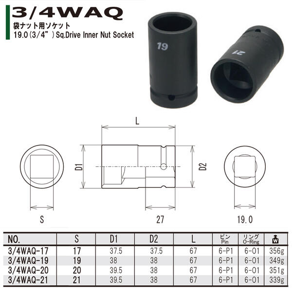 商品情報メーカーFPC品番3/4WAQ-21仕様・スペック【サイズ】21mm(四角形状)【差込角】19.0mm(3/4sq.)【全長】67mm【重量】339g【オーリングピン】6P-01■自動車整備やタイヤ交換等で使われる大型車両のインナーナットの着脱に最適な袋ナット用ソケット。●専用ソケットなので安心してご利用いただけます。●高品質日本製品で安心安全なプロクオリティソケットです。●オーリングピン付仕様です。●様々な車種に合う豊富なサイズバリエーション。サイズバリエーション【19.0mm(3/4)袋ナット用ソケット】17mm (3/4WAQ-17)19mm (3/4WAQ-19)20mm (3/4WAQ-20)21mm (3/4WAQ-21)【対応オーリングピン】17mm〜21mm用ソケットバリエーション【19.0mm(3/4)単品ソケット】ショートソケット (3/4WS)セミロングソケット (3/4WA)ロングソケット (3/4WAU)袋ナット用ソケット (3/4WAQ)コンビネーションソケット (3/4WBQ)エクステンションバー (3/4WETB)※各サイズはリンクページ内からお選び下さい。FPC 袋ナット用ソケット 四角形状 21mm 差込角19.0mm 3/4 sq オーリングピン付 インナーナット着脱用 インパクト対応 四角 回す 締める 緩める 外す 脱着 ボルト エアー 自動車 大型車両 バス トラック 整備 メンテナンス 四角ソケット 日本製 3/4WAQ-21 フラッシュツール 【差込角19.0mm(3/4)四角形状のインナーナットの取り外しに最適なインパクト用ソケット!】 2