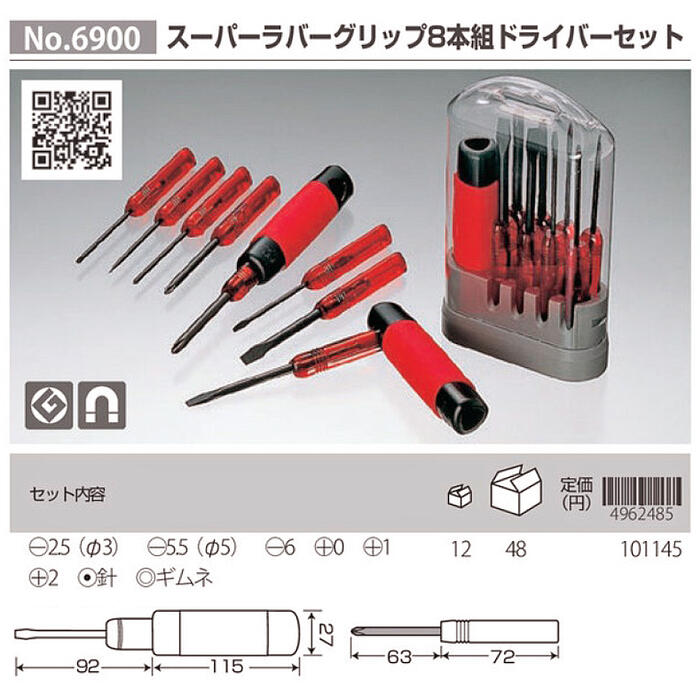 商品情報メーカー兼古製作所品番NO.6900仕様・スペック【セット内容】◆マイナスドライバー:-2.5(φ3)、-5.5(φ5)、-6◆プラスドライバー:+0、+1、+2◆針◆ギムネ◆差替式電工グリップ●使用頻度の高いサイズ入れたセットです。ストレート型とL型の使い分けができる差替グリップ付き。●刃先はネジを落とさないマグネット付仕様を採用しました。バリエーション【5本組ドライバーセット】HOME 5ドライバーセット (No.5850) 【6本組ドライバーセット】ドライバーセット (No.6006)【8本組ドライバーセット】ラチェット付ドライバーセット (No.5700)ドライバーセット (No.5800)POP電工グリップドライバーセット (No.6880)電工グリップドライバーセット (No.6950)スーパーラバーグリップドライバーセット (No.6900)【12本組ドライバーセット】精密ドライバー付ドライバーセット (No.5910)ANEX 8本組ラバーグリップドライバーセット ケース付き -2.5 -5.5 -6 +0 +1 +2 針 ギムネ 差替式グリップ付 ねじ回し 早回し L型 ストレート ハンドル 換装可能 工具セット ドライバー ハウスキーピング DIY ホームメンテナンス プラス マイナス #6900 兼古製作所 【一家に一台!あらゆる場面で活躍間違いなしの日本製ドライバーセットの決定版!】 2