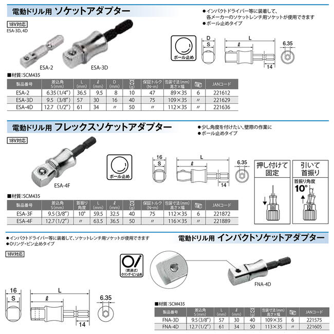 商品情報 メーカー トップ工業品番 ESA-4DFNA-4D仕様・スペック 【差込角】6.35mm(1/4)【駆動角】12.7mm(1/2)【材質】SCM435【生産国】日本●インパクトドライバー等に装着して、各メーカーのソケットレンチ用ソケットが使用できる変換アダプターです。●18Vインパクト対応で電動ドライバーの他、インパクトドライバーにも使用出来ます。●脱着のしやすいボール止めタイプと、オーリングピンでしっかり固定するピン止めタイプの2種類からお選びください。バリエーション凹6.35mmから凸6.35mmへ変換 (ESA-2)※ボール止めタイプのみの取り扱いです。凹6.35mmから凸9.5mmへ変換 (ESA-3D/FNA-3D)※ボール止めタイプまたはオーリングピン止めタイプからお選びください。凹6.35mmから凸12.7mmへ変換 (ESA-4D/FNA-4D)※ボール止めタイプまたはオーリングピン止めタイプからお選びください。凹6.35mmから凸9.5mmまたは凸12.7mmへ変換 (ESA-3F/ESA-4F)※駆動角は製品ページからお選びください。ボール止めタイプのみの取り扱いです。インパクトドライバーで四角ドライブのソケットが使用出来る、18V対応の変換アダプターシリーズ! 【着脱が簡単なボール止めタイプ・しっかり固定するオーリンピン止めタイプからお選びください!】 2