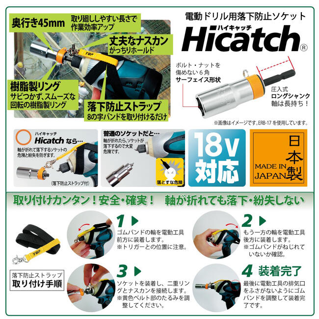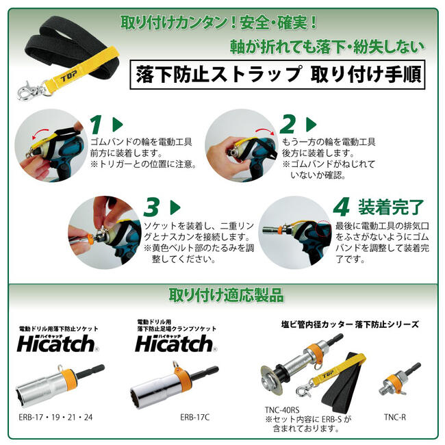 商品情報 メーカー トップ工業品番 ERB-19S仕様・スペック 【ソケットサイズ】19mm【仕様】リング付きソケット・落下防止ストラップ付きセット【口径】6角【材質】SCM435【保証トルク】75N.m【生産国】日本■付属の落下防止ストラップの使用で、軸部が折れても落下しない、安全安心設計のリング付き落下防止ソケット!●万が一ビットが折れても安全ストラップとインパクトドライバーとの連結で落下しない!高所作業で安全安心のソケットです。●ボルト・ナットを傷めない六角サーフェイス形状を採用しました。●六角シャンク部は6.35mmでインパクトドライバーに素早く装着して使用できます。●六角シャンク部が圧入式で、軸折れ強度に優れています。●厳選した材料を使用して、オール国産の安全・安心を提供する日本製です。●本製品は安全ストラップとソケットが1つずつ入ったセット品です。バリエーション【落下防止ソケット単品】落下防止ソケット 17mm単品(ERB-17)落下防止ソケット 19mm単品(ERB-19)落下防止ソケット 21mm単品(ERB-21)落下防止ソケット 24mm単品(ERB-24)落下防止ソケット足場クランプ用 17mm単品(ERB-17C)【落下防止ソケット・安全ストラップ付セット】ストラップ付落下防止ソケット 17mm(ERB-17S)ストラップ付落下防止ソケット 19mm(ERB-19S)ストラップ付落下防止ソケット 21mm(ERB-21S)ストラップ付落下防止ソケット 214mm(ERB-24S)ストラップ付落下防止足場クランプ用ソケット 17mm(ERB-17CS)【落下防止ストラップ単品】落下防止ストラップ(ERB-S)【安心安全の日本製!落下防止対策バッチリの安全設計ソケット、Hicatchシリーズ!】付属の落下防止ストラップとの組み合わせで、万が一の軸折れにおけるソケットの落下を未然に防ぐ!高所作業でも安心安全の落下防止ソケットシリーズ! 2