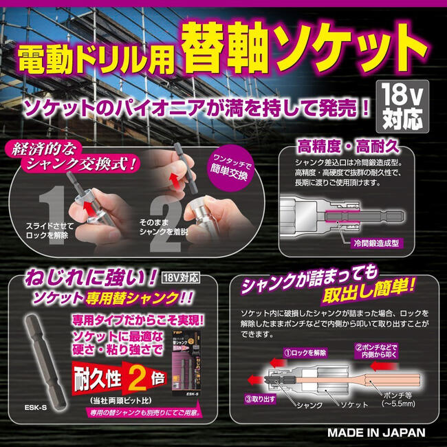商品情報 メーカー トップ工業品番 ESK-17L仕様・スペック 【ソケットサイズ】17mm【全長】ロングタイプ【仕様】ビット交換式【口径】6角【材質】SCM435【保証トルク】75N.m【生産国】日本■軸部が折れても交換できる!ソケットの寿命までビットを交換するだけでずっと使い続けられる替え軸タイプの電ドルソケットです!●首下の長いボルト・ナットにも使用出来るロングタイプです。●ボルト・ナットを傷めない六角サーフェイス形状を採用しました。●六角シャンク部は6.35mmでインパクトドライバーに素早く装着して使用できます。●軸部は別売りの交換シャンクで差替える事が出来ます。●厳選した材料を使用して、オール国産の安全・安心を提供する日本製です。●ワンタッチで簡単着脱!長く使い続けられるので経済的です。バリエーション【替え軸ソケット セミロング】替軸ソケット 17mm(ESK-17)替軸ソケット 19mm(ESK-19)替軸ソケット 21mm(ESK-21)替軸ソケット 24mm(ESK-24)替軸ソケット 26mm(ESK-26)替軸ソケット 27mm(ESK-27)替軸ソケット 30mm(ESK-30)替軸ソケット 32mm(ESK-32)替軸ソケット 36mm(ESK-36)【替軸ソケット ロングタイプ】替軸ロングソケット 17mm(ESK-17L)替軸ロングソケット 19mm(ESK-19L)替軸ロングソケット 21mm(ESK-21L)替軸ロングソケット 24mm(ESK-24L)【レースウェイ対応替軸スーパーロングソケット】替軸スーパーロングソケット 17mm(ESK-17SL)【替軸ソケット用替えシャンク】専用替えシャンク 2本(ESK-S)【安心安全の日本製!】ビット軸が折れても交換できる!ソケットの寿命まで使い続けられるから経済的!インパクトドライバーで使えるビット交換式の国産替え軸型ソケット!首下の長いボルト・ナットでも使えるロングタイプです! 2