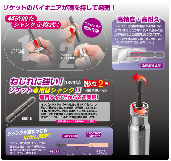 トップ工業 替軸ソケット 17mm ロングタイプ ビット交換式ソケット 18V対応 インパクトドライバー 電動ドライバー 6.35mm 電ドルソケット 着脱式 高耐久 超ロングタイプ 日本製 ESK-17L TOP