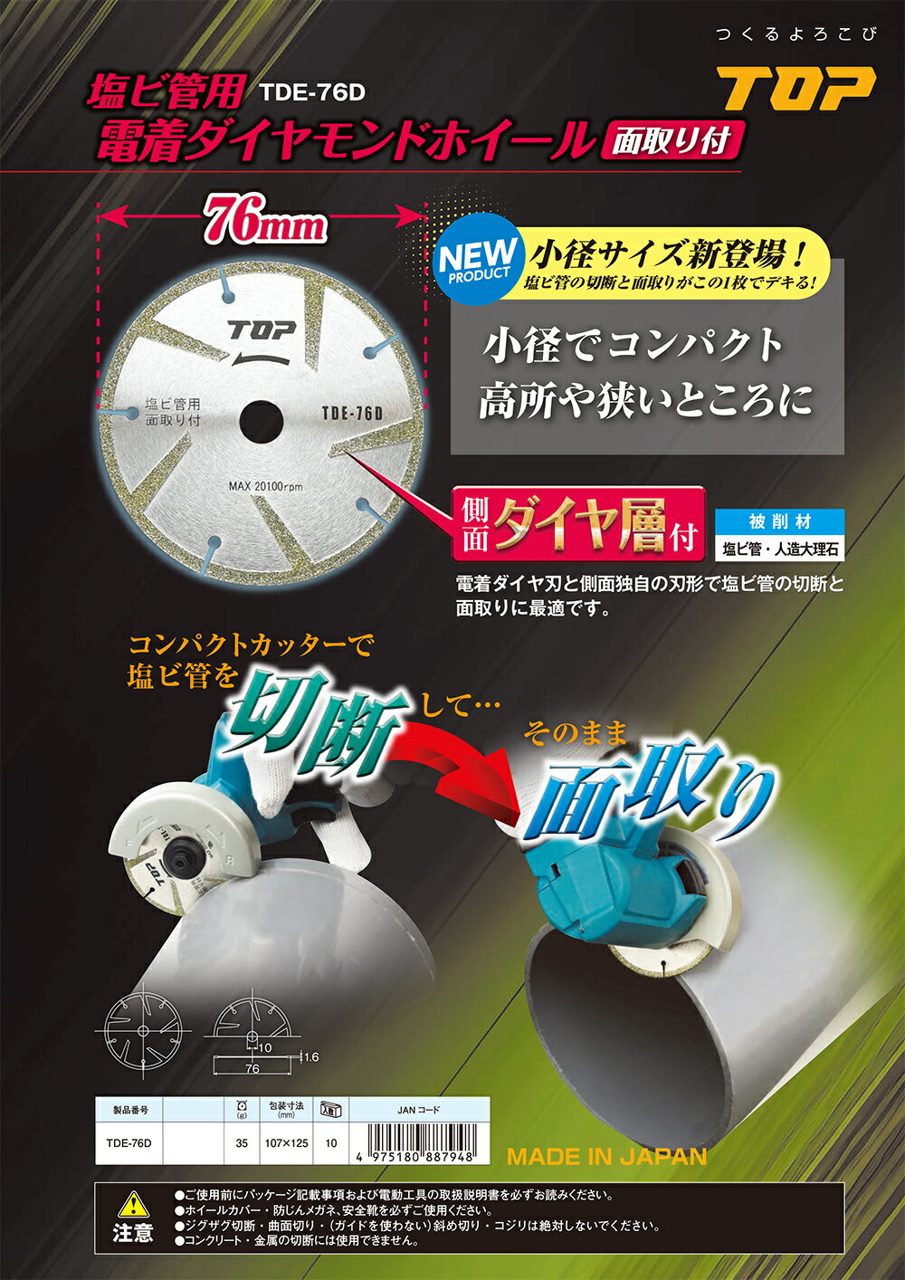 トップ工業 塩ビ管用電着ダイヤ 面取り付 ディスクグラインダー用先端工具 エンビパイプバリ取り機能付き 人造大理石 キッチンパネル 塩ビパイプ 配管 水道 管材 ガス 日本製 TDE-76D TDE-105D TDE-125DR TOP
