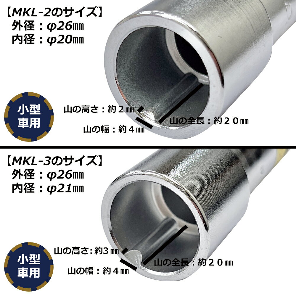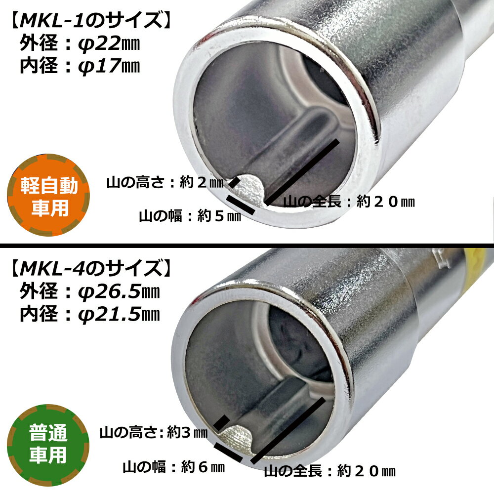商品情報メーカーFPC品番MKL-1 / MKL-2 / MKL-3 / MKL-4 / MKL-S仕様・スペック【差込サイズ】17mm (MKL-1)19mm (MKL-2 / MKL-3)21mm (MKL-4)【対応車種】軽自動車用 (MKL-1)小型車用 (MKL-2 / MKL-3)普通車用 (MKL-4)【用途】ロックナット外しに【使用方法】クロスレンチに接続してお使い下さい(手動専用)【生産国】日本■自動車整備におけるロックナットを緊急に取り外す際に使えるレスキューツール!●軽自動車・小型車・普通車の3種類のバリエーションを用意しました。●キーナット外しの緊急用ソケットです。取り外し専用にお使いください。●汎用タイプですが、対応できるキーナットには限りがあります。●必ずクロスレンチ等の手動工具に取り付けてお使い下さい。電動で使うとソケットが割れる恐れがあります。タイヤ交換時等でのロックナット・キーナットの紛失時に重宝する緊急取り外し工具! 【軽自動車・小型車・普通自動車に対応する4つのバリエーション!クロスレンチを使って手動でお使い下さい】 2