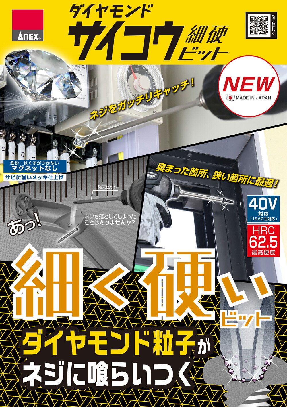 商品情報メーカーアネックスツール品番ADSK-2150仕様・スペック【先端サイズ】 +2【全長】 150mm【ビット形状】テーパー形状【軸径】φ3.8【先端】マグネット無し (ダイヤモンド粒子付)【生産国】日本■角部や狭い隙間に入り込む細さを極めた究極の細軸ビットに、抜群の食いつき力が魅力のダイヤモンド粒子をプラスした、ダイヤモンドサイコウビット!細くても強度が高くなるよう先端硬度を上げ、耐久力も兼ね備えました!●ウッドデッキや引き戸レール、手すり用の金具のネジ締め作業などでの、狭い隙間でもビットが入り込む軸径に設計しました。●先端硬度はHRC62.5の最高硬度で設計。細くても強靭なつくりで設計されました。●ガスバーナーやコンセントボックス等、従来のドライバーでは入らなかった箇所でもスムーズに入り、様々な作業で幅広く対応が可能です。●ビットは段付きタイプなのでチャック内でガタツキが少なく作業効率が高まります。●錆びに強いメッキ仕上げを採用し、先端部にはマグネットを付けたプロ仕様です。●+1タイプはテーパー形状になっており下穴錐のような形状で、先端に近づくにつれ軸径が細くなっていき、更に作業性が向上しました。●マグネット無しでもマグネット付のような食い付き力が魅力です。バリエーション【サイコウビット 2本組】(+)1 全長: 65mm (ASKM-1065)(+)1 全長: 100mm (ASKM-1100)(+)2 全長: 65mm (ASKM-2065)(+)2 全長: 100mm (ASKM-2100)(+)2 全長: 150mm (ASKM-2150)【サイコウビット 5本組】(+)2 全長: 65mm (ASKM5-2065)(+)2 全長: 100mm (ASKM5-2100)(+)2 全長: 150mm (ASKM5-2150)【ダイヤモンドサイコウビット 2本組】(+)1 全長: 65mm (ADSK-1065)(+)1 全長: 100mm (ADSK-1100)(+)2 全長: 65mm (ADSK-2065)(+)2 全長: 100mm (ADSK-2100)(+)2 全長: 150mm (ADSK-2150)究極の細さに最高硬度の硬さをプラスした電動ドライバー・インパクトドライバー対応のサイコウビットに、食い付き力抜群のダイヤモンド粒子をプラスした、ワンランク上のサイコウビット!細軸のドライバーよりもスリムなので、今まで入らなかった隙間にも入り込むことが可能になりました! 【ウッドデッキやレール溝のネジ締め作業、小さな穴の中にある狭所でのネジまわしに最適!】 2