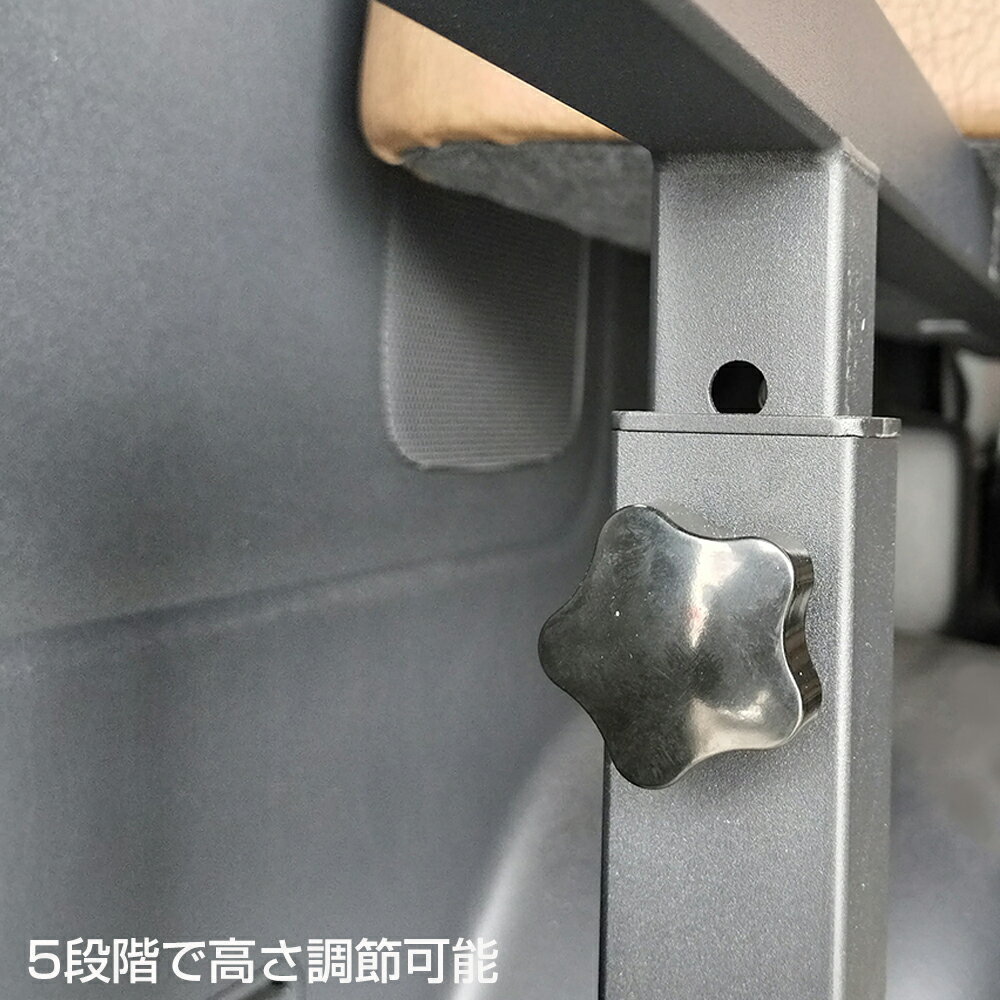 商品情報適合車種ハイエース200系適合年式3型後期〜7型、8型適合グレード標準S-GL、ワイドS-GL適合不可DX、ワゴンGL、グランドキャビン4分割パイプ式ベッドキット 高さ調節可能 ハイエース ワイド 車中泊 標準・ワイド ハイエース 車中泊 高さ調節可能 ベッドキット セカンドシートを畳んでスペースを最大限に使用可 4分割パイプ式ベッドキット [適合車種]ハイエース、レジアスSGL、ダークプライム、ダークプライム2標準、ワイド[適合不可]DX、ワゴン[天板カラー]・ブラックレザー・アンティーク・ヴィンテージ[商品詳細]厚さ4cmのクッションが効いたマットレスを使用。フロアからマット下まで38cm、41.5cm、45cm、48.5cm、52cmと5段階の高さ調節が可能。41.5cm(下から2段目)にするとリアシートの背もたれを倒したときにほぼフラットになります。(有効スペース2m24cm)■車両に使用できる難燃素材。■タイダウンフックが装備されており、ベッドフレームを設置していても使用可能。 高さ調節可能 車中泊時はセカンドシートを畳んでフラットに。 タイダウンフック付き 車中泊する方 アウトドア好きな方 車旅する方 2週間前後での発送になります。1
