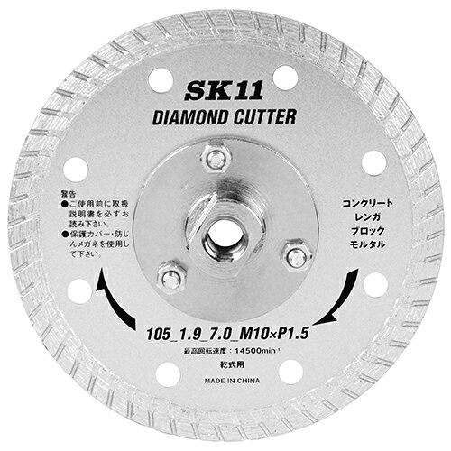 用途コンクリートやブロックなどの際切り切断に使用。フランジ付なのでディスク本体にそのままねじ込み、際切り切断が可能です。刃先はウェーブ形状により、切断面のチッピングが少なく綺麗な切り口です。仕様1●外径:105mm。●内径(ネジ径):M10xP1.5mm。●刃厚:1.9mm。●ダイヤ幅:7.0mm。●乾式用。●最高回転速度:14500min-1。●使用機種:ディスクグランダー100mm。