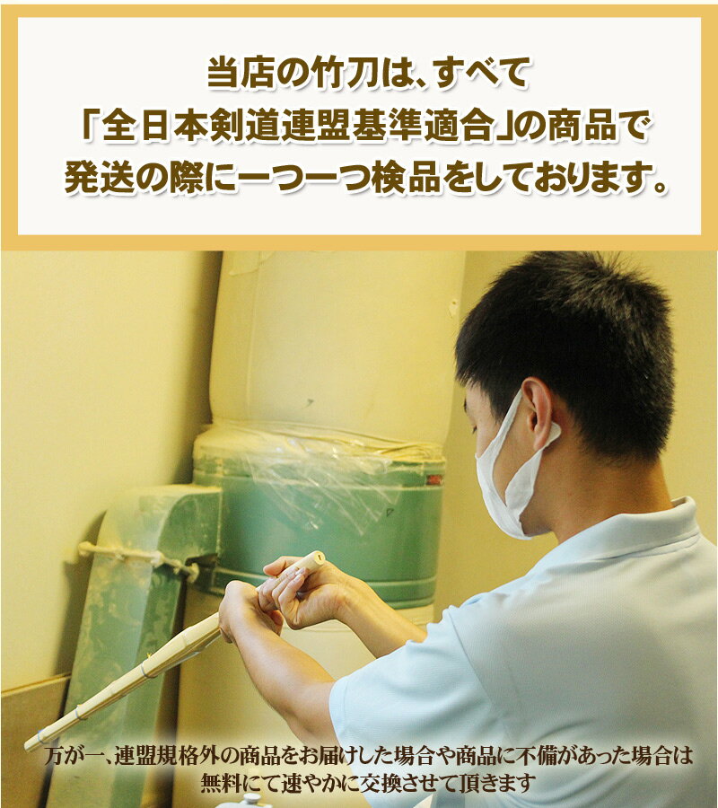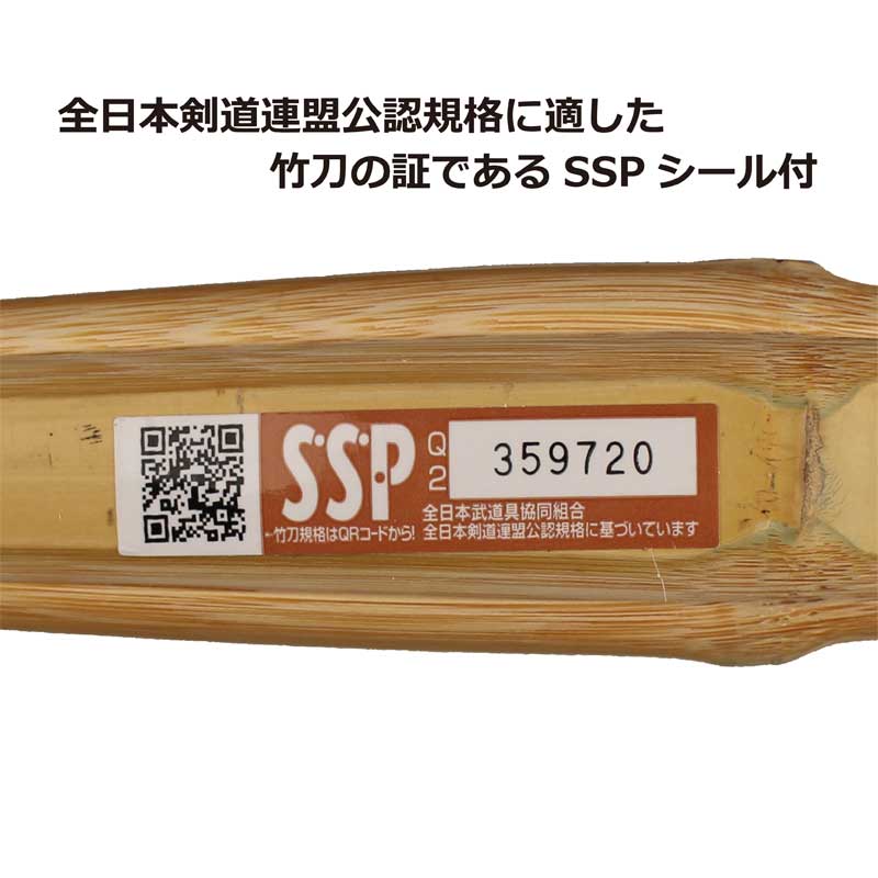 商品詳細 素材 竹刀・・・・・・・竹 先皮、柄皮・・・・牛革 中締め、チップ・・牛革 先ゴム・・・・・・ゴム ツル・・・・・・・テトロン サイズ 3.9尺男子用、510グラム〜530グラム 3.9尺女子用、440グラム〜460グラム 特徴 SSPシール付き 初心者から上級者までどなたでも使用できます、低価格の竹刀になります。 当店の竹刀は、すべて「全日本剣道連盟基準適合」の商品で 発送の際に一つ一つ検品をしております。 万が一、連盟規格外の商品をお届けした場合や商品に不備があった場合は 無料にて速やかに交換させて頂きます 耐久性に優れ使いやすいバランスも抜群! 4つのポイント 耐久性に自信があります!安心にご使用いただけます。 主に練習で使う竹刀(実際の試合でもご利用頂けます)は打ち込みが多くなるので耐久性が必要です。 耐久性にも一切の妥協せずこだわりの安心・安全の竹刀を作成しております。 1本1本職人の手作り 職人が1本1本手作りで作成しております。 既製品の竹刀とは物が違います。 是非、あなたの手でこの本物の竹刀を触って 実際に体感してみてください。