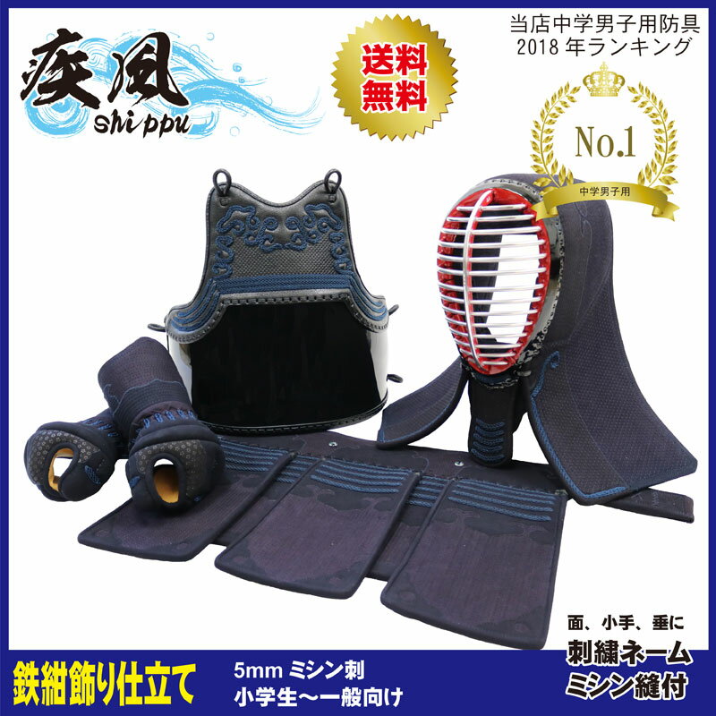 【期間限定★エントリーで全品ポイント5倍】剣道 防具 防具セット 4点(面・胴・小手・垂) 送料無料 「疾風」 5ミリナナメ刺 剣道防具 刺繍ネーム無料 サイズ交換1度送料無料 乳革、面紐、胴紐付き 武道園