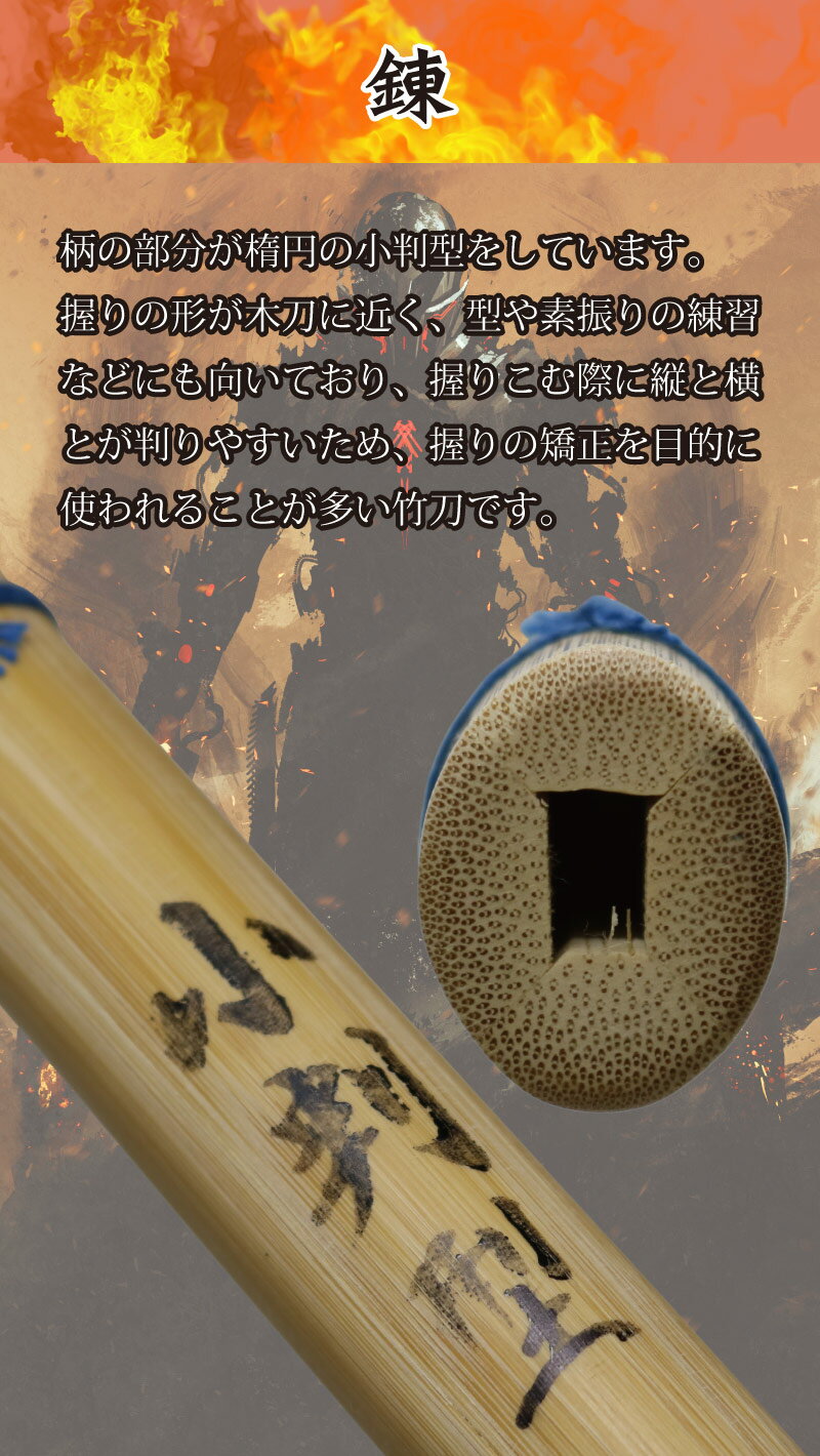商品詳細 素材 竹刀・・・・・・・竹 先皮、柄皮・・・牛革 中締め・・・・・牛革 先ゴム・・・・・天然ゴム ツル・・・・・・テトロン サイズ 3.6尺 3.5尺 3.4尺 3.3尺 3.2尺 3.0尺 2.8尺 特徴 柄の部分が楕円の小判型をしています。 握りの形が木刀に近く、型や素振りの練習などにも向いており、 握りこむ際に縦と横とが判りやすいため、 握りの矯正を目的に使われることが多い竹刀です。 SSPシール付 当店の竹刀は、すべて「全日本剣道連盟基準適合」の商品で 発送の際に一つ一つ検品をしております。 万が一、連盟規格外の商品をお届けした場合や商品に不備があった場合は未使用品に限り 無料にて速やかに交換させて頂きます 耐久性に優れ使いやすいバランスも抜群! 安心・安全のSSPマーク付き! 安全基準を認めるマークで 4つのポイント 耐久性に自信があります!安心にご使用いただけます。 主に練習で使う竹刀(実際の試合でもご利用頂けます)は打ち込みが多くなるので耐久性が必要です。 耐久性にも一切の妥協せずこだわりの安心・安全の竹刀を作成しております。 1本1本職人の手作り 職人が1本1本手作りで作成しております。 既製品の竹刀とは物が違います。 是非、あなたの手でこの本物の竹刀を触って 実際に体感してみてください。 注意 商品画像のサイズと商品ページに記載のサイズが違う場合がございます。 商品ページに記載されておりますサイズをお届けいたします。