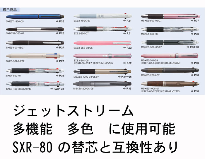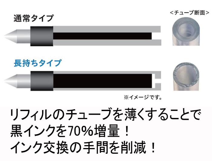 リフィルのチューブを薄くすることによりUNI通常品(SXR-80)と同じ形状で 互換性を保ったままインク量をアップし、通常品比で約70%の増量に成功。 チューブが薄くなることで、プラスチック使用量も通常品に比べ約30%減量しています インク色 黒 SXR-ML-05 JANコード 4902778282366 【 適合商品 】 ・ジェットストリーム MSXE4-600-07 ・ジェットストリーム SXE2-300-07 ・ジェットストリーム SXE3-400-05(-07)(-38) ・ジェットストリーム SXE3-800-05(-07) ・ジェットストリーム SXE3-JSS-05(-38) ・ジェットストリーム SXE4-500-07 ・ジェットストリーム スタイラス 3色ボールペン SXE3T-1800-05 1P ・ジェットストリーム スタイラス SXE3T-1800-05 ・ジェットストリーム スタイラス SXNT82-350-07 ・ジェットストリーム スタイラス シングルノックSXNT82-350-07 1P ・ジェットストリーム 多機能ペン 4&1 Metal Edition MSXE5-2000A-05 ・ジェットストリーム2 & 1 MSXE3-500-05(-07) ・ジェットストリーム2 &1 MSXE3-800-05(-07) ・ジェットストリーム4 &1 MSXE5-1000-05(-07)(-38) ・ジェットストリームF シリーズ SXE3-601-05 ・ジェットストリームFシリーズ2&1 MSXE3-701-05 ・ピュアモルト MSXE3-1005-07 ・ピュアモルト MSXE5-2005-07