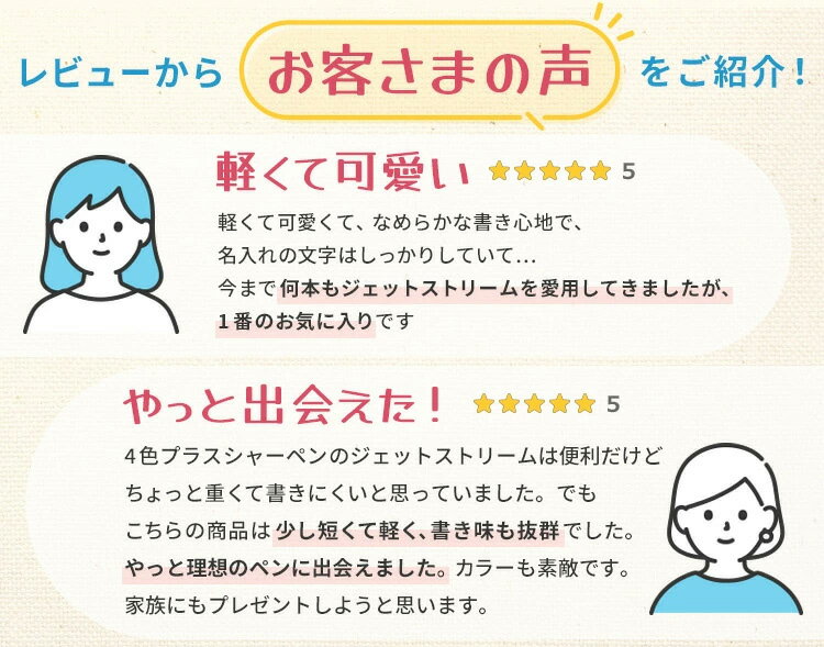 ▼ほかのジェットストリームシリーズを見る▼ ボールペン 名入れ ジェットストリーム4&1 多機能ペン ライトタッチインク搭載 三菱鉛筆 uni JETSTREAM Lite touch ink 実用的で気持ちも上がるプレゼント 【名前入り】の特別なギフト 名入れ筆記具 なめらかな書き心地の油性ボールペンとして絶大な人気を誇る「ジェットストリーム」の多機能筆記具 仕事、勉強、手帳のお供、これがあれば安心の一本 名前を入れて特別な贈りものに ★『JETSTREAM Lite touch ink(ジェットストリーム ライトタッチインク)』は、 従来のジェットストリームインクよりさらに筆記抵抗を減らし、よりストレスの無い安定した”かろやか”な書き心地を実現した新インクです。 時代や環境により「書く・描く」シーンが多様化する中で生まれた、JETSTREAMの新しい選択肢です。 ★選べる書体とマークで、特別な名入れをオーダーメイド! 職場で、自宅で、カフェで、取り出すだけでほっこり癒される、刺しゅうのようなカラーマーク名入れ 自分へ、友人へ、職場や学校、部活の先輩・後輩へ、お祝いやお礼の気持ちを込めたプレゼントにもぴったりです 自分や贈る相手の好みに合わせて楽しく選べる名入れギフト 入学祝 卒業祝 就職祝 誕生日 父の日 母の日 記念品 記念日 結婚祝 結婚記念日 送別会 餞別 御祝 内祝 名入れペン 名前入り 卒業記念品 卒団記念品 部活 野球 バスケット サッカー バレーボール 女性 男性 小学生 中学生 高校生 小学校 中学校 高校 国内メーカー 筆記具 ジェットストリーム 名入れ ボールペン ライトタッチインク ジェットストリーム 名入れ ボールペン ライトタッチインク はギフトにおすすめ ジェットストリーム 名入れ ボールペン ライトタッチインク は自分用へのプレゼントに ジェットストリーム 名入れ ボールペン ライトタッチインク はくすみカラーが魅力 ジェットストリーム 名入れ ボールペン ライトタッチインク は書体の種類も豊富! ジェットストリーム 名入れ ボールペン ライトタッチインクは当店の人気商品! ジェットストリーム 名入れ ボールペン ライトタッチインク を買うなら当店で! [u01][u03][u04][u07][u08][v02]ナチュラルなワンポイントマーク ※画像内のマークはこちらの商品では選択不可能なマークとなっています 💐 姉妹店「REGALO」では別デザインで販売中モチーフに思いを込める【Wishシリーズ】 💐 ▼ ギフトラッピング(※有料)に対応しています ▼ 三菱鉛筆 [uni]ジェットストリーム 多機能ペン 4&1 (Lite touch ink 搭載) 品名 MSXE5-LS-05 機構 ノック式 5機能ペン0.5mm 4色(黒・赤・青・緑)油性 ボールペン + 0.5mmシャープペン※商品、付属品、ケース等の仕様、デザインは予告なく変更になる場合がございます。 JETSTREAMLite touch ink 『JETSTREAM Lite touch ink(ジェットストリーム ライトタッチインク)』とは、従来のジェットストリームインクよりさらに筆記抵抗を減らし、より”かろやか”な書き心地を実現した新インクです。またインクのボテや紙すべり(※)をさらに改良し、よりストレスの無い安定した筆記を提供します。時代や環境により「書く・描く」シーンが多様化する中で生まれた、JETSTREAMの新しい選択肢です。※紙質などの条件により、ボールがすべり筆記しにくい現象 替芯 SXR-L80-05JETSTREAM Lite touch ink 多色多機能用リフィル★ 既存の替芯との互換性あり。替芯「SXR-80-05/07/038」もお使いいただけます。 ◆ ライトタッチインク替芯 [ SXR-L80-05 ] 単品はこちら 本体色 ・メローホワイト [MSXE5LS05.1][JAN:4902778313886] ・スチールブルー [MSXE5LS05.71][JAN:4902778313916] ・ミストブルー [MSXE5LS05.79][JAN:4902778313923] ・グラスグリーン [MSXE5LS05.18][JAN:4902778313893] ・コーラルピンク [MSXE5LS05.66][JAN:4902778313909] ・グロスグレー [MSXE5LS05G.23][JAN:4902778345108] ・グロスベージュ [MSXE5LS05G.45][JAN:4902778345115] \定番JETSTREAMはこちら!/