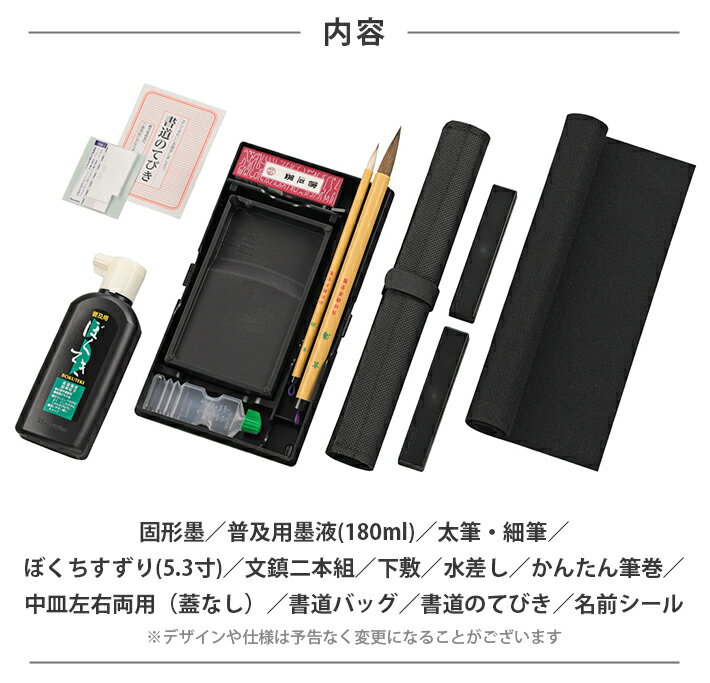 スタイリッシュなハードバッグタイプ!フルオープンで使いやすい! 飽きのこないシンプルなデザイン! 半紙の収納に便利なチャック付袋入りです。 【セット内容】 書道ケース(中皿・筆巻つき・蓋なし) ・呉竹墨 ・筆(太筆・細筆セット) ・セット用墨滴(180ml) ・ぼくちすずり(5.3寸) ・ぶんちん ・下敷き両面スベリ止 ・ポリ水差し 【仕様】 ・サイズ:330×260×50mm ・反射板付 ・隠しネームホルダー ※お使いの画面環境により画像の色味に多少の差異が生じます。予めご了承ください。