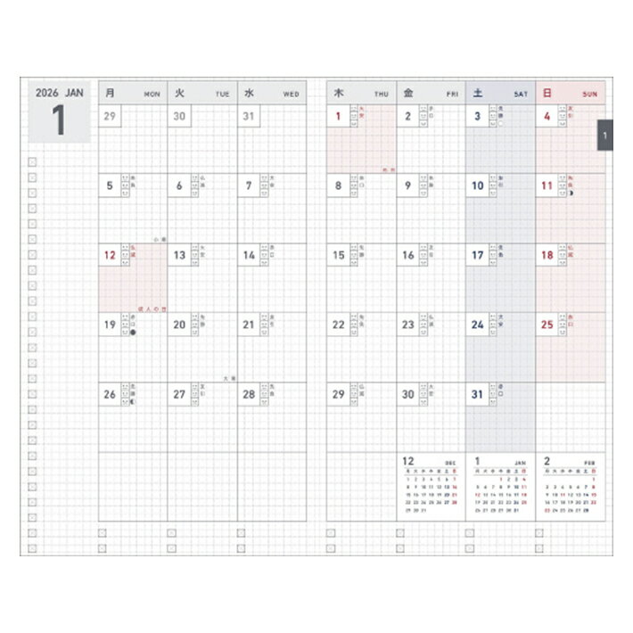 ビジネスシーンでも使いやすい、マットカバー付き「ジブン手帳Biz」のスリムタイプです。 落ち着いた色味とフォントでビジネスやプライベートにも対応。 月の予定を俯瞰できる月間ブロックや、毎日の記録に便利な週間バーチカルなど、タスクの進捗管理を後から見返した時に情報が探しやすく便利! ※LIFEとIDEAはセットされていません。 【期間】 月間:2025年12月~2027年3月 週間:2025年12月~2027年1月2週目 【内容】 月間ブロック 月間プロジェクト 週間バーチカル 3年分カレンダー 年齢早見表 年間スケジュール 今年(今年度)の夢/目標 お金の計画 週間予定 お気に入りの言葉 おすすめ・本・映画リスト プレゼントリスト 約束したことリスト フリーリスト 今年やりたい100のリスト 今年の振り返り 個人データ 日本地図 【仕様】 A5スリムサイズ(217×138mm) カバー材質:PVC 本文:104枚 ダイアリー 手帳 自分 ビズ タスク 管理 シンプル