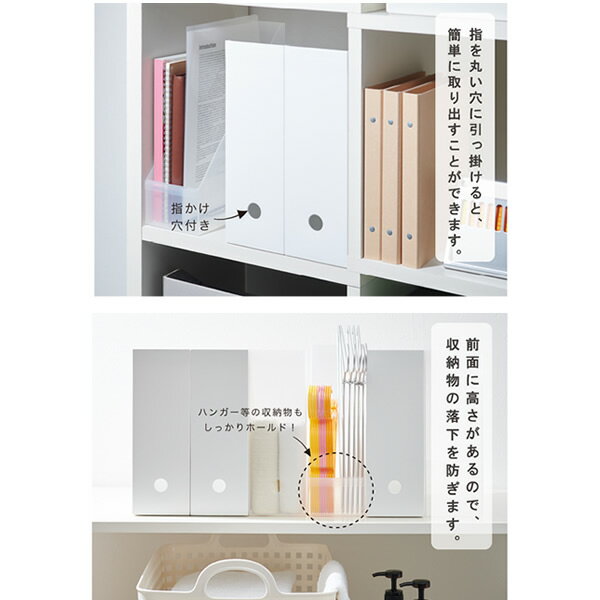 軽くて丈夫。 安定感抜群の収納ボックス。 ●引き出しに便利な指かけ穴付き(指を丸い穴に引っ掛けると、簡単に取り出すことができます)。 ●前面に高さがあるので、収納物の落下を防ぎます。 ●家庭やオフィスでなじみやすいシンプルなデザイン。 ●水や汚れも弾く素材だから、水周りの収入にも使えます。 規格 A4タテ型 サイズ (縦×横×幅) 305・105・245 底面内寸:W100・D235 本体材質 再生PP カラー −71 オフホワイト(OW) −90 クリア(T)