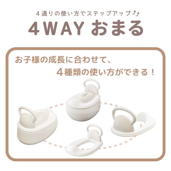 【商品説明】4通り使えるトイレトレーニング用おまるです。やさしいグレージュカラーがどんなお部屋やトイレにも合わせやすくなっています。4種類の使い方ができるので、成長に合わせてステップアップできます。STEP1 おまるとして(1才頃から)・取っ手付きおまる、背もたれ付きおまると2通りの使い方が出来ます。STEP2 補助便座として(1才6ヶ月頃から6才頃まで)・取っ手付き補助便座、腰かけタイプ補助便座と2通りの使い方が出来ます。取っ手を外して取っ手なしタイプでもご使用頂けます。●おまる使用時はポット付きなので、後片付けが簡単です。●おまる、補助便座、前後のご使用で4種類の使い方ができ、お子様の成長にあわせて長期間使用できます。●商品サイズ:W28.5cm×D38.5cm×H27.5cm●パッケージサイズ:W28.5cm×D38.5cm×H18.5cm●材質:【ポリプロピレン】本体・ポット・フタ・取っ手・便座 【TPR】便座のフチのゴム部分・本体裏面すべり止め部分 【スチール】ネジ●対象年齢:1才頃から6才頃まで
