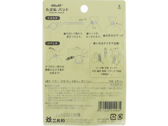【商品説明】普通の輪ゴムとは使い方が違います。まきつけてひっかけるだけ!タブをひっぱって簡単にはずす事が出来ます。【仕様】●色:ミックス(ピンク・オレンジ・ライトグリーン・ライトブルー・ホワイト×各1)●番手:#18×3●サイズ:内径44.5mm、折径70mm、切幅3mm、×厚さ1.1mm●材質:天然ゴム●注文単位:1パック(5本)【備考】※メーカーの都合により、パッケージ・仕様等は予告なく変更になる場合がございます。【検索用キーワード】きょうわ キョウワ Kyowa たばねばんど タバネバンド TABANEBAND 輪ゴム わごむ ワゴム ゴムバンド オーバンド oband #18×3 1パック 1袋 5本 MIX ピンク ぴんく 桃色 ももいろ モモイロ pink オレンジ おれんじ 橙色 だいだいいろ orange ライトグリーン 黄緑 きみどり キミドリ lightgreen ライトブルー 水色 みずいろ ミズイロ lightblue 白 しろ シロ ホワイト white 結束用品 GHT−602TMX GHT602TMX 収納 便利 携帯 かわいい おしゃれ 束ね 梱包資材 ひも ロープ E29441
