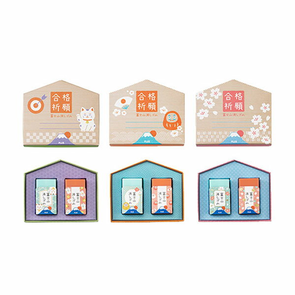 大人気富士山消しゴムの限定企画第7弾。メッセージを書き込める絵馬型ボックスは、頑張る受験生へのプレゼントにぴったり。縁起の良い伝統色を組み合わせた個装箱と、消しゴムケースには合格祈願にちなみ 招き猫・だるま・さくらといったモチーフをあしらいました。メッセージを書き込める特製絵馬型のボックスは、受験等の願掛けにお薦めです。“消して作る"自分だけの富士山。「本来消しゴムは、間違った文字や修正したい個所を消す道具。どうせなら、『消す』を、もっと楽しくできないか?」こんな思いから、この消しゴムは生まれました。2層構造の樹脂で構成された消しゴムが、徐々に削れていくうちに見せる姿は、まるで雄大な曲線美を描く、富士山のよう。左右前後バランスよく消すことで、自分だけの富士山をつくることができます。もちろん、使用している樹脂は通常のエアインと同じ配合で作っているため、消し心地も抜群です。消しゴムに求められる『よく消える』機能と、『消す楽しみ』を同時に実現する、新しい消しゴムです。【仕様】3柄アソート(ランダムになります。)【外形寸法】W99 x D85 x H20mm【特長】多孔質セラミックスパウダーの働きで、いつもカドで消す感触の消しゴム【材質】本体=PVC、ケース、ボックス=紙