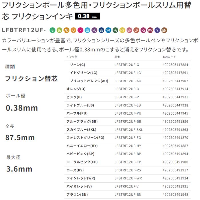 パイロット フリクションインキ 替芯 LFBTRF12UF 【0.38mm】 1本 インク全17色 多色用 レフィル こすると消える FRIXION