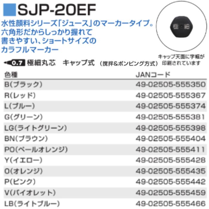 ●商品名:PILOT 水性マーカー Juice Paint ●型番:SJP-20EF-B / SJP-20EF-R / SJP-20EF-L / SJP-20EF-G / SJP-20EF-LG / SJP-20EF-BN / SJP-20EF-PO / SJP-20EF-Y / SJP-20EF-O / SJP-20EF-P / SJP-20EF-V / SJP-20EF-LB ●インク色:ブラック、レッド、ブルー、グリーン、ライトグリーン、ブラウン、ペールオレンジ、イエロー、オレンジ、ピンク、バイオレット、ライトブルー ●インク種類:水性顔料 ●サイズ:最大径Φ16.3×120mm ●筆記線幅:0.7mm ●入り数:1本
