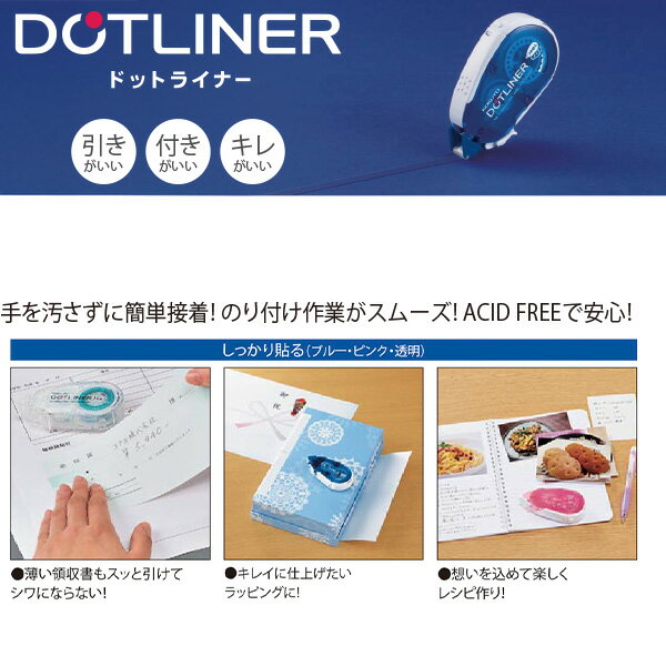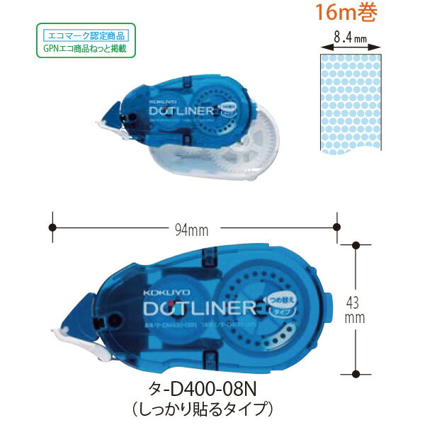 コクヨ ドットライナー詰め替え用テープ3個パック 強粘 8.4mm タ-D400-08NX3 のり テープのり 詰替え用 リフィル 接着 のり 強力 まとめ買い 3個セット ドットライナー強粘着サイズテープ幅8.4mm × 長さ16m入数3個パック品番タ-D400-08NX3対応本体 タ-DM400-08N / タ-DM400-08NT / タ-DM400-08NT-S1特徴 「コクヨ ドットライナー 詰め替え用テープ 強粘 タ-D400-08NX3」は、しっかり貼れる強粘タイプの詰替え用テープ3個セットです。幅8.4mmのドットのりで、プリントや封筒の接着など幅広い用途に対応します。強力接着の強粘タイプ通常タイプよりも粘着力が強く、はがれにくい接着力を実現。厚紙や重要書類の固定にも安心です。幅8.4mmのドットのりムラなくきれいに塗れるドットパターン。紙同士の接着に最適で、のりはみ出しも少なく仕上がりがきれいです。経済的な3個パック詰め替え用リフィルが3個セットになったお得パック。まとめ買いで常備用にも便利です。簡単交換で使いやすいカートリッジ式でワンタッチ交換可能。詰め替えが簡単でスムーズに作業できます。信頼のコクヨ製事務用品の定番ブランド「コクヨ」による高品質テープのり。オフィス・学校・家庭で幅広く活用できます。メーカー希望小売価格はメーカーカタログに基づいて掲載しています。こちらの商品は商品1個につき1個口分のゆうパケットの送料に設定しています。